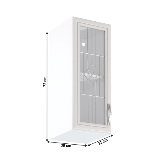Horní skříňka G30S se sklem levá ke kuchyni SICILIA Provedení: DTD laminovaná/MDF lišty/sklo Barva: bíla/sosna Andersen Rozměry (ŠxHxV): 30x32x72 cm Tloušťka materiálu: 15 mm Spodní skříňky jsou dodávány bez pracovní desky. Můžete si objednat pracovní desku royal beigemarble k provedení ořech Milano - tloušťka 28mm za 1.590 Kč/bm a nebo pracovní desku dub Lancelot k provedení sosna andersen - tloušťka 38 mm za 1.690 Kč/bm.