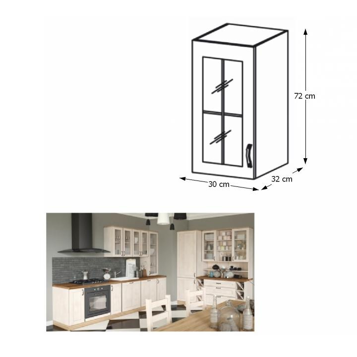 Horní skříňka s dvířky se sklem, ROYAL G30S, levá Materiál: korpus je vyroben z kvalitní laminované dřevotřísky / kovová úchytka / sklo Barva: bílá / dvířka v provedení sosna skandinávská Rozměry ŠxHxV: 30x32x72 cm Tloušťka materiálu: 15 mm Systém tichého zavírání dvířek Dodávané v demontu. Spodní skříňky ke kuchyni ROYAL jsou dodávány bez pracovní desky a bez soklu. Pracovní desku Dub Porterhouse tmavý lze doobjednat v tloušťce 3,8 cm v ceně 1690 Kč/1 bm. Ke každé dolní skříňce, kromě rohových skříněk D25PZ, je třeba doobjednat i sokel v provedení dub divoký v ceně 270 Kč/1 bm a 2 kusy úchytů na sokl v ceně 30 Kč/2 ks. Ke spodním skříňkám máte možnost dokoupit také ukončení na sokl o hloubce 47 cm a 56 cm za 210 Kč. Objednávku vepište do poznámky v objednávkovém formuláři.