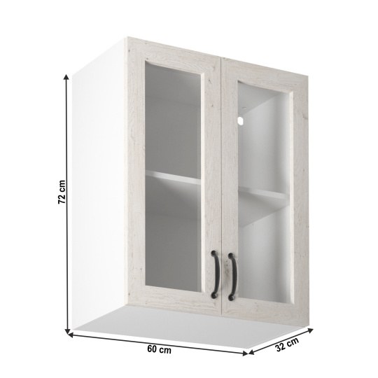 Horní skříňka s dvířky se sklem, ROYAL G60S Materiál: korpus je vyroben z kvalitní laminované dřevotřísky / kovová úchytka/sklo Barva: bílá / dvířka v provedení sosna skandinávská Rozměry ŠxHxV: 60x32x72 cm Tloušťka materiálu: 15 mm Systém tichého zavírání dvířek Dodávané v demontu. Spodní skříňky ke kuchyni ROYAL jsou dodávány bez pracovní desky a bez soklu. Pracovní desku Dub Porterhouse tmavý lze doobjednat v tloušťce 3,8 cm v ceně 1690 Kč/1 bm. Ke každé dolní skříňce, kromě rohových skříněk D25PZ, je třeba doobjednat i sokel v provedení dub divoký v ceně 280 Kč/1 bm a 2 kusy úchytů na sokl v ceně 30 Kč/2 ks. Ke spodním skříňkám máte možnost dokoupit také ukončení na sokl o hloubce 47 cm a 56 cm za 140 Kč. Objednávku vepište do poznámky v objednávkovém formuláři.