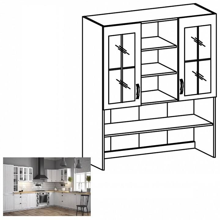 Horní skříňka s dvířky se sklem a policemi ke kuchyni Provance Provedení: DTD laminovaná / MDF / sklo Barva: bílý / sosna andersen Rozměry (ŠxHxV): 120x32x127 cm Tloušťka materiálu: 15 mm Systém tichého zavírání dvířek Spodní skříňky jsou dodávány bez pracovní desky. Pracovní deska v tloušťce 3 cm. Ke spodním skříňkám je třeba doobjednat sokl. Ke každé spodní skříňce, kromě dřezové D25PZ, je třeba doobjednat ještě 2 kusy úchytů na sokl. Cena za pracovní desku dub lancelot je 1.690, - Kč za bm- tloušťka je 38 mm, cena za spodní lištu je 390, - Kč za bm. Cena ukončení na sokl s hloubkou 47 cm nebo 58 cm je 140 Kč. Ke každé dolní skříňce, kromě D25PZ, je třeba doobjednat 2 ks úchytek na sokl - cena 30, - Kč / 2Ks.