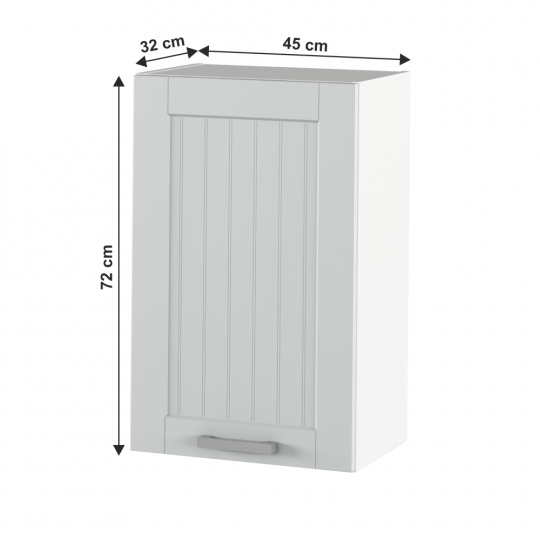 Materiál skříňka: DTD laminovaná / MDF fóliovaná Barva skříňka: světlešedá / bílá Materiál úchytky: kov Barva úchytky: matný chrom Rozměry (ŠxHxV): 45x32x72 cm Tloušťka materiálu: 16 mm S dvířky policová S kovovou úchytkou Kvalitní slovenský výrobek Dodávané v demontu Cena sektorových skříněk je včetně soklů, bez pracovní desky. Cena za pracovní desku je 1.290,-Kč za bm - tloušťka 38 mm.