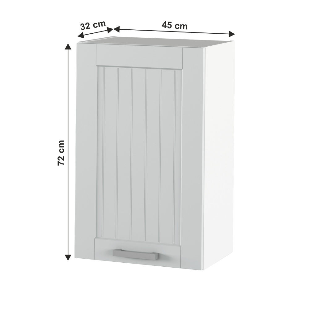 Materiál skříňka: DTD laminovaná / MDF fóliovaná Barva skříňka: světlešedá / bílá Materiál úchytky: kov Barva úchytky: matný chrom Rozměry (ŠxHxV): 45x32x72 cm Tloušťka materiálu: 16 mm S dvířky policová S kovovou úchytkou Kvalitní slovenský výrobek Dodávané v demontu Cena sektorových skříněk je včetně soklů, bez pracovní desky. Cena za pracovní desku je 1.290,-Kč za bm - tloušťka 38 mm.