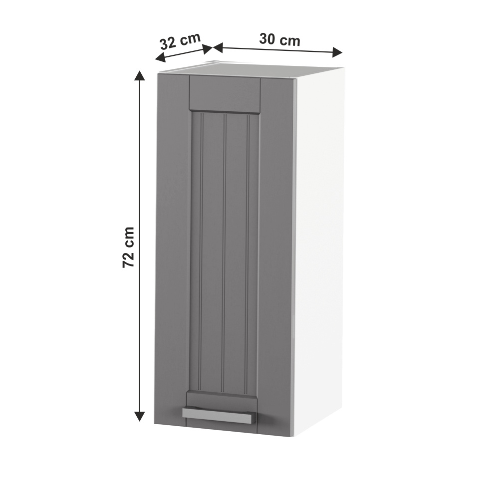 Materiál skříňka: DTD laminovaná / MDF fóliovaná Barva skříňka: tmavě šedá / bílá Materiál úchytky: kov Barva úchytky: matný chrom Rozměry (ŠxHxV): 30x32x72 cm Tloušťka materiálu: 16 mm S dvířky policová S kovovou úchytkou Kvalitní slovenský výrobek Dodávané v demontu Cena sektorových skříněk je včetně soklů, bez pracovní desky. Cena za pracovní desku je 1.290,-Kč za bm - tloušťka 38 mm.