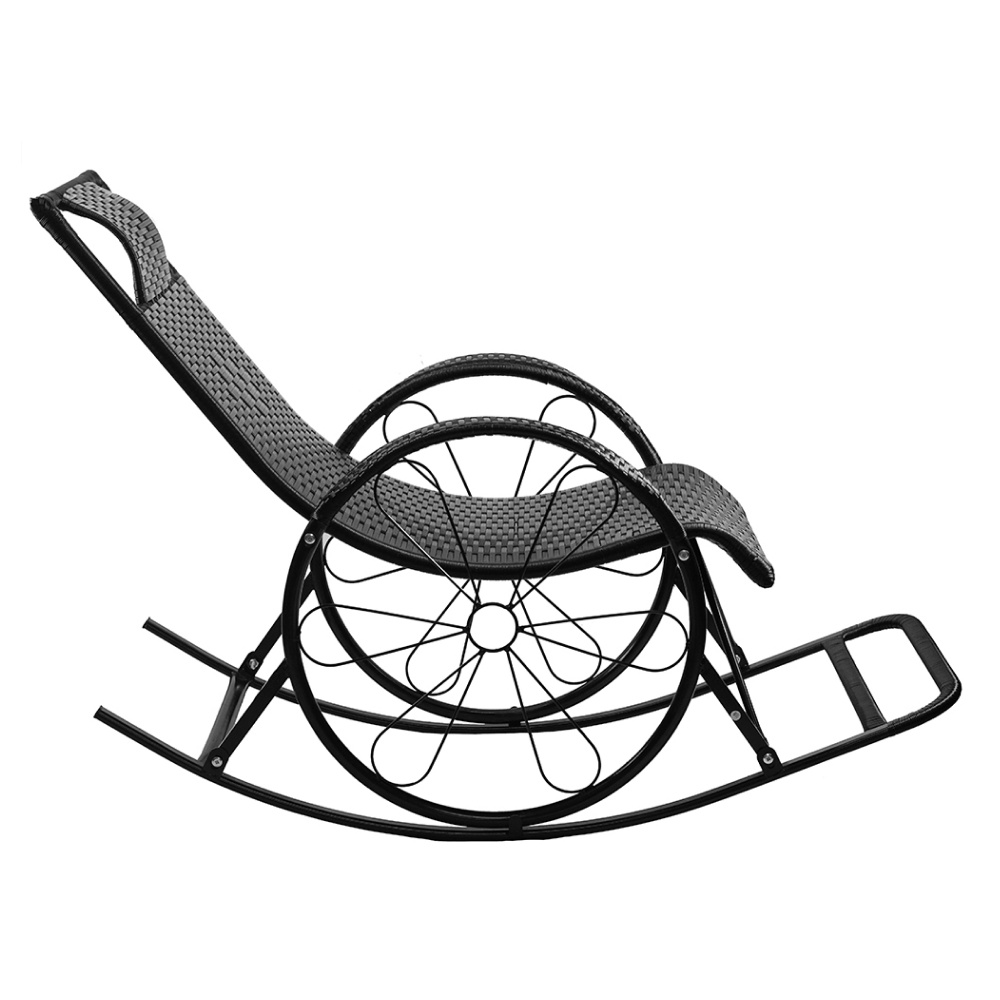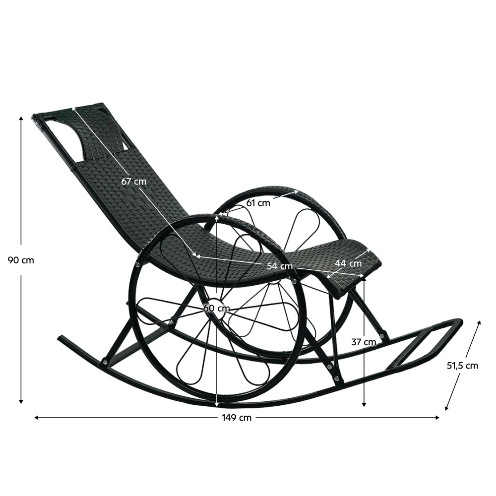 Materiál: technický ratan/kov Barva: černá Rozměry (ŠxHxV): 51,5x149x90 cm Výška sedu: 37 cm Hloubka sedu: 54 cm Šířka sedu: 44 cm Šířka zádové opěrky: 44 cm Výška zádové opěrky: 67 cm Výška opěrky na ruku od země: 60 cm Nosnost: max. 120 kg Houpací Relaxační Pohodlné Područka ve tvaru kola Vhodné do interiéru a na kryté terasy Doporučujeme výrobek chránit před nepříznivými povětrnostními podmínkami, aby se prodloužila životnost výrobku Dodáváno v demontu