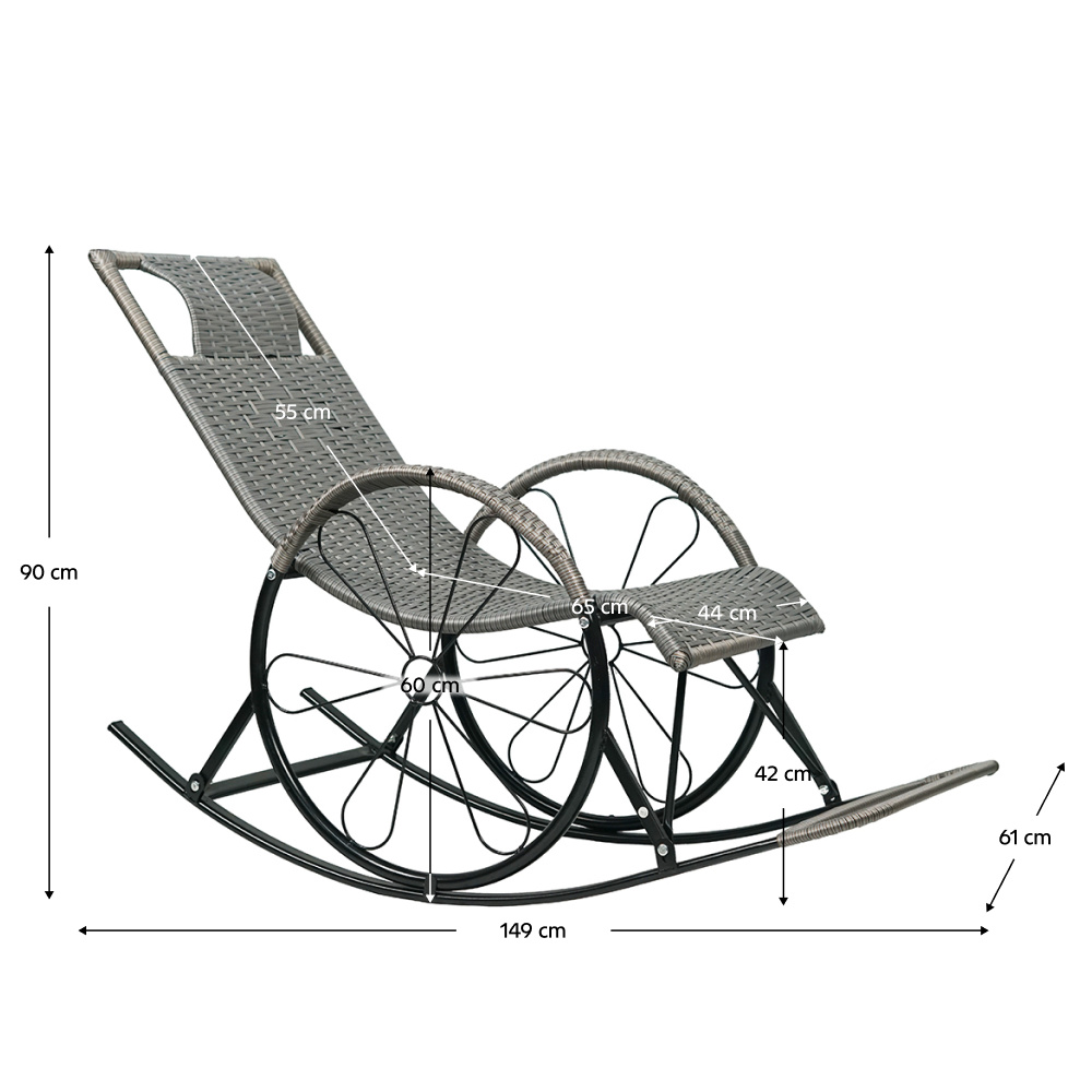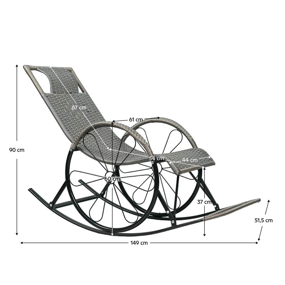 Materiál: technický ratan/kov Barva: šedá Rozměry (ŠxHxV): 51,5x149x90 cm Výška sedu: 37 cm Hloubka sedu: 54 cm Šířka sedu: 44 cm Šířka zádové opěrky: 44 cm Výška zádové opěrky: 67 cm Výška opěrky na ruku od země: 60 cm Nosnost: max. 120 kg Houpací Relaxační Pohodlné Područka ve tvaru kola Vhodné do interiéru a na kryté terasy Doporučujeme výrobek chránit před nepříznivými povětrnostními podmínkami, aby se prodloužila životnost výrobku Dodáváno v demontu
