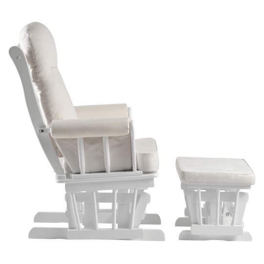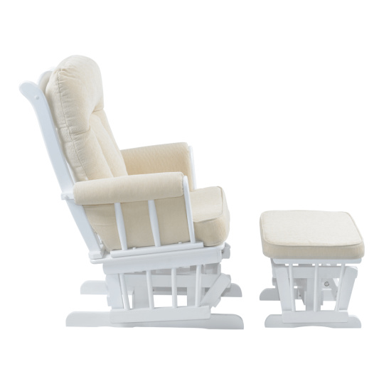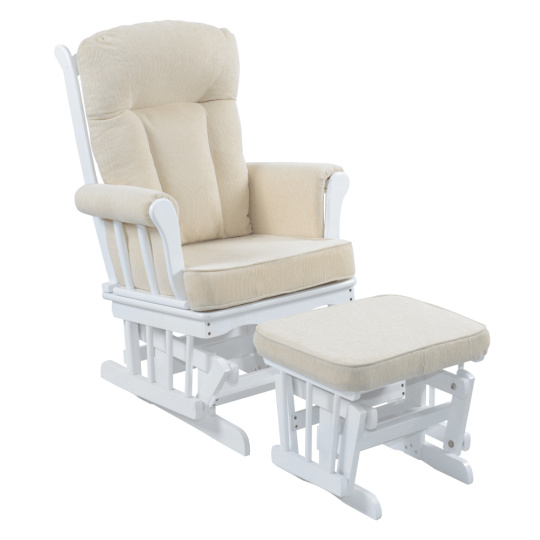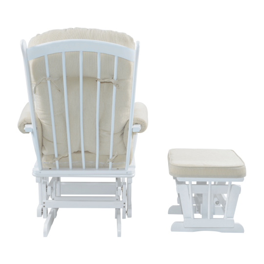 Materiál: látka/masivní kaučukové dřevo Oděruodolnost textilie dle testu Martindale: 65 000 oděrů Barva: bílá/krémová Rozměry křeslo (ŠxHxV): 71x81x104 cm Rozměry podnož (ŠxHxV): 50x39x38 cm Výška sedu: 48 cm Hloubka sedu: 46 cm Šířka sedu: 46 cm Výška zádové opěrky: 65 cm Šířka zádové opěrky: 54 cm Nosnost: 110 kg Houpací mechanismus Relaxační Designové Pohodlné Dodáváno s podnoží Podnož s houpacím mechanismem Dodáváno s polštáři Výplň polštářů: molitán Tloušťka polštáře na zádové opěrce: 10 cm Tloušťka polštáře na sedáku: 8 cm Tloušťka polštáře na podnoži: 4,5 cm Potah není snímatelný Čistit jen vlhkým hadříkem Dodáváno v demontu
