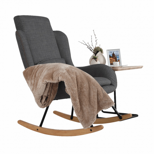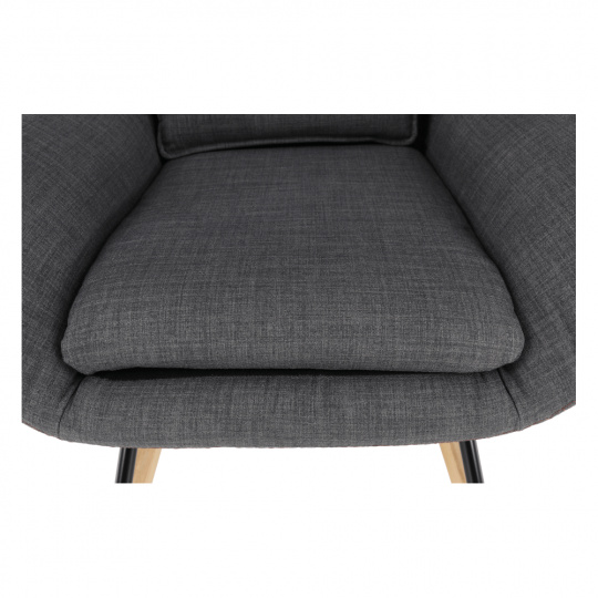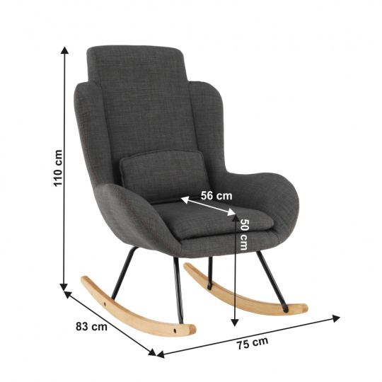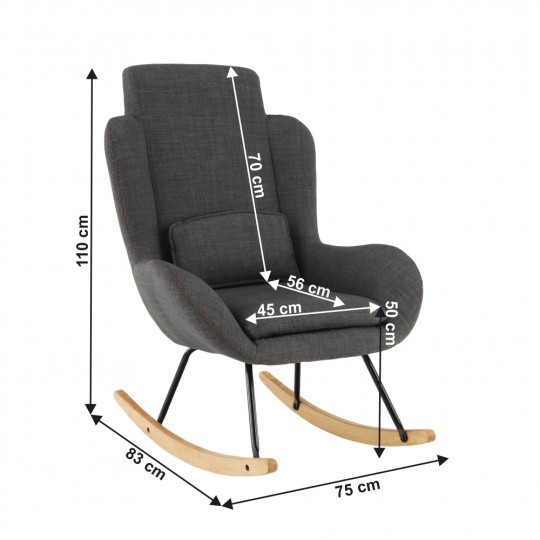 Houpací a relaxační křeslo HARPER materiál: látka / dřevo / kov Oděruodolnost textilie podle testu Martindale: 90 000 oděrek barva: šedá / přírodní / černá Rozměry (ŠxHxV): 75x83x110 cm Výška sedu: 50 cm Hloubka sedu: 56 cm Šířka sedu: 45 cm Výška opěradla: 70 cm Nosnost: 120 kg