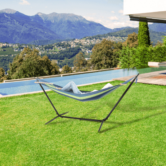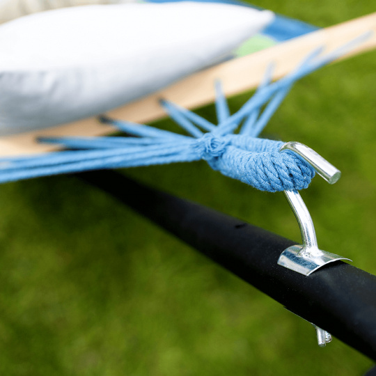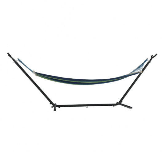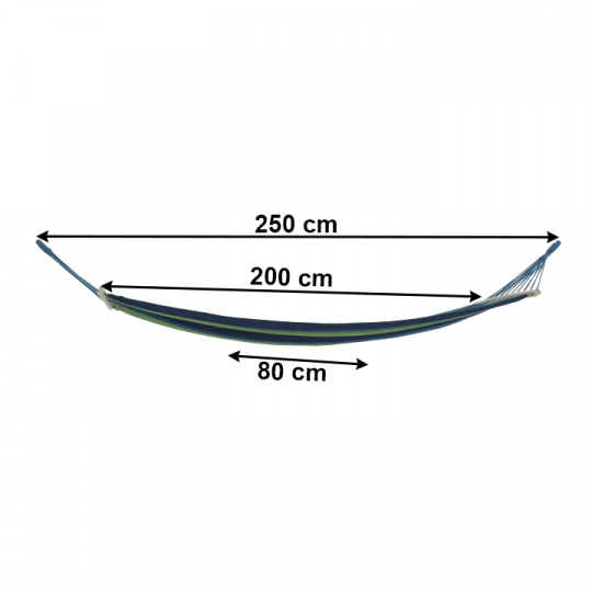 Houpací síť Evana New Materiál: bavlna / dřevo / polyester Plocha na ležení (ŠxD): 80x200 cm Celková délka: 250cm Barva: tyrkysová / modrá / zelená Nosnost: 120 kg Stojan není součástí balení, můžete si doobjednat Dodávané v demontu