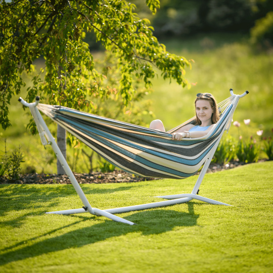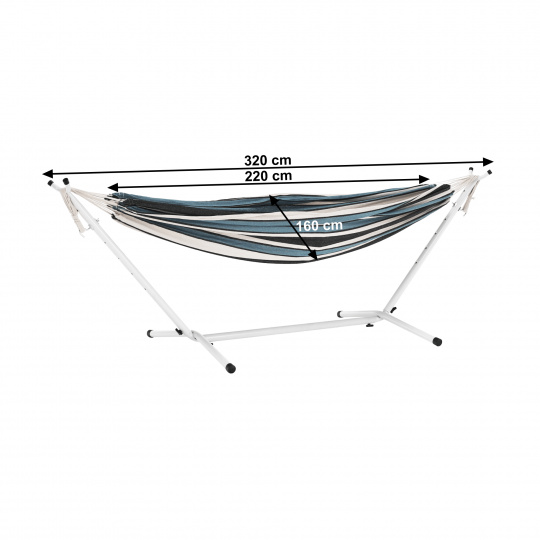 Materiál sítě: 50% bavlna / 50% polyester Barva: vzor modrý proužek Rozměry (ŠxD): 160x220 cm Celková délka: 320 cm Nosnost: 200 kg Vhodná pro dvě osoby Vhodná do interiéru a extriéru Možnost různorodého zavěšení Dodávané v demontu Dodávané bez stojanu