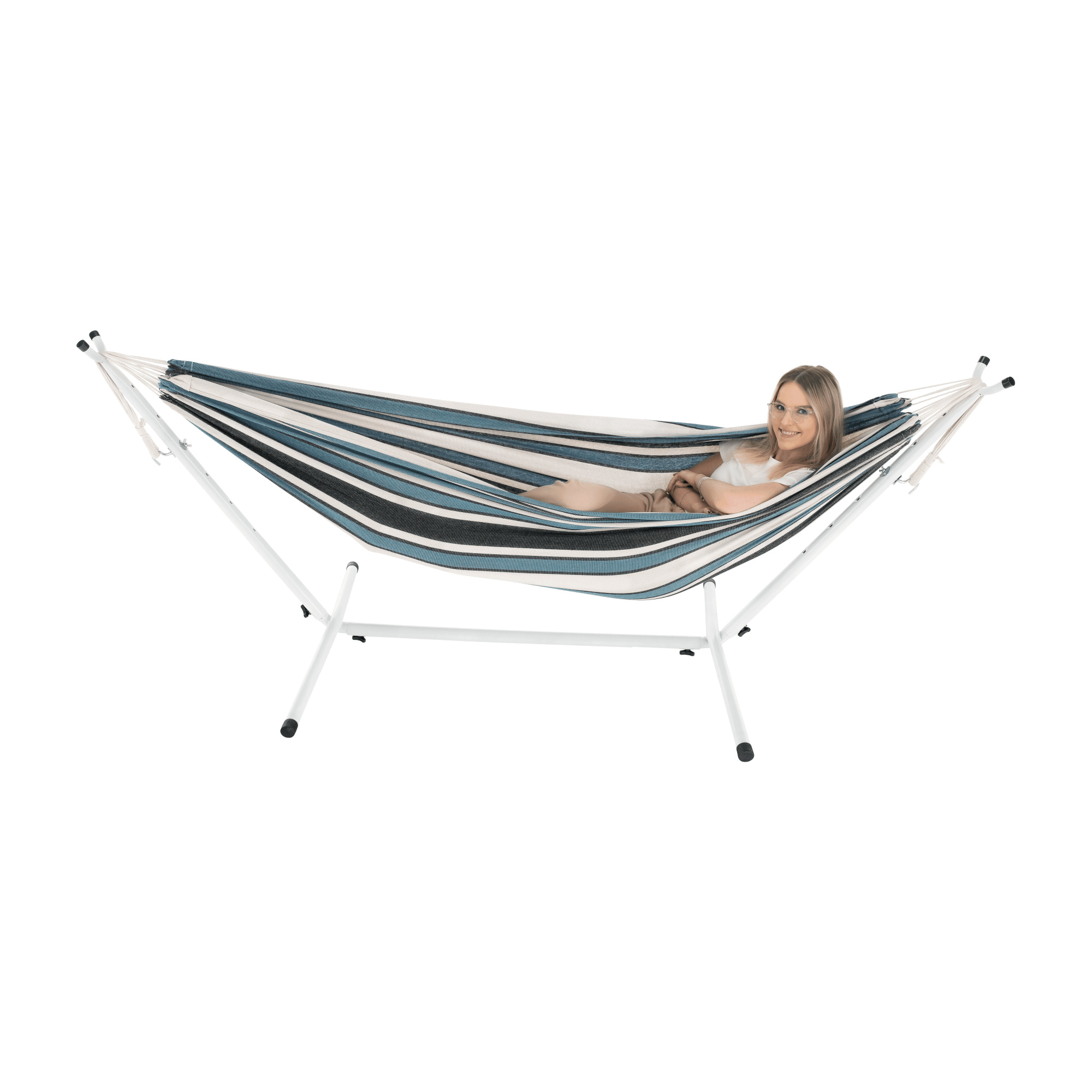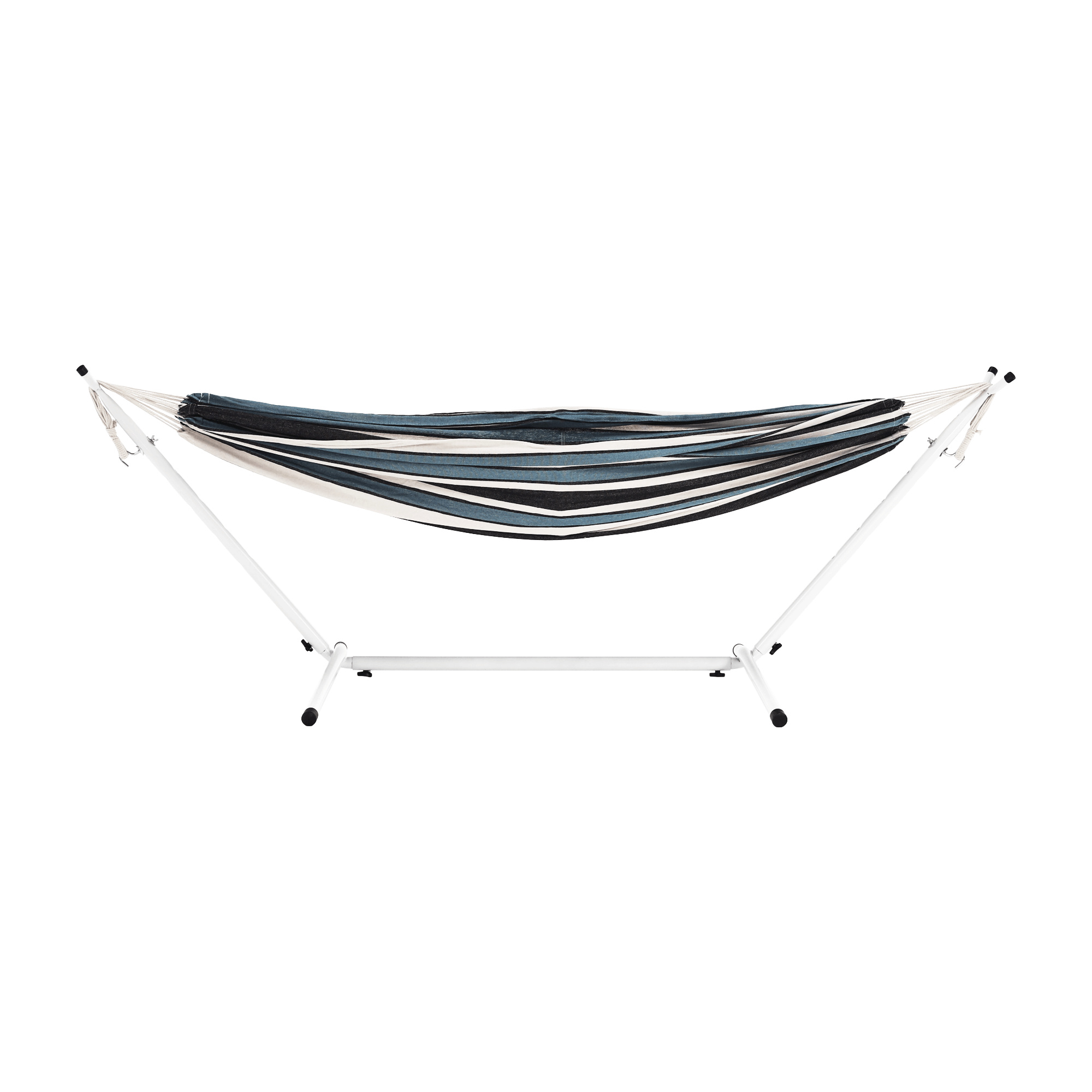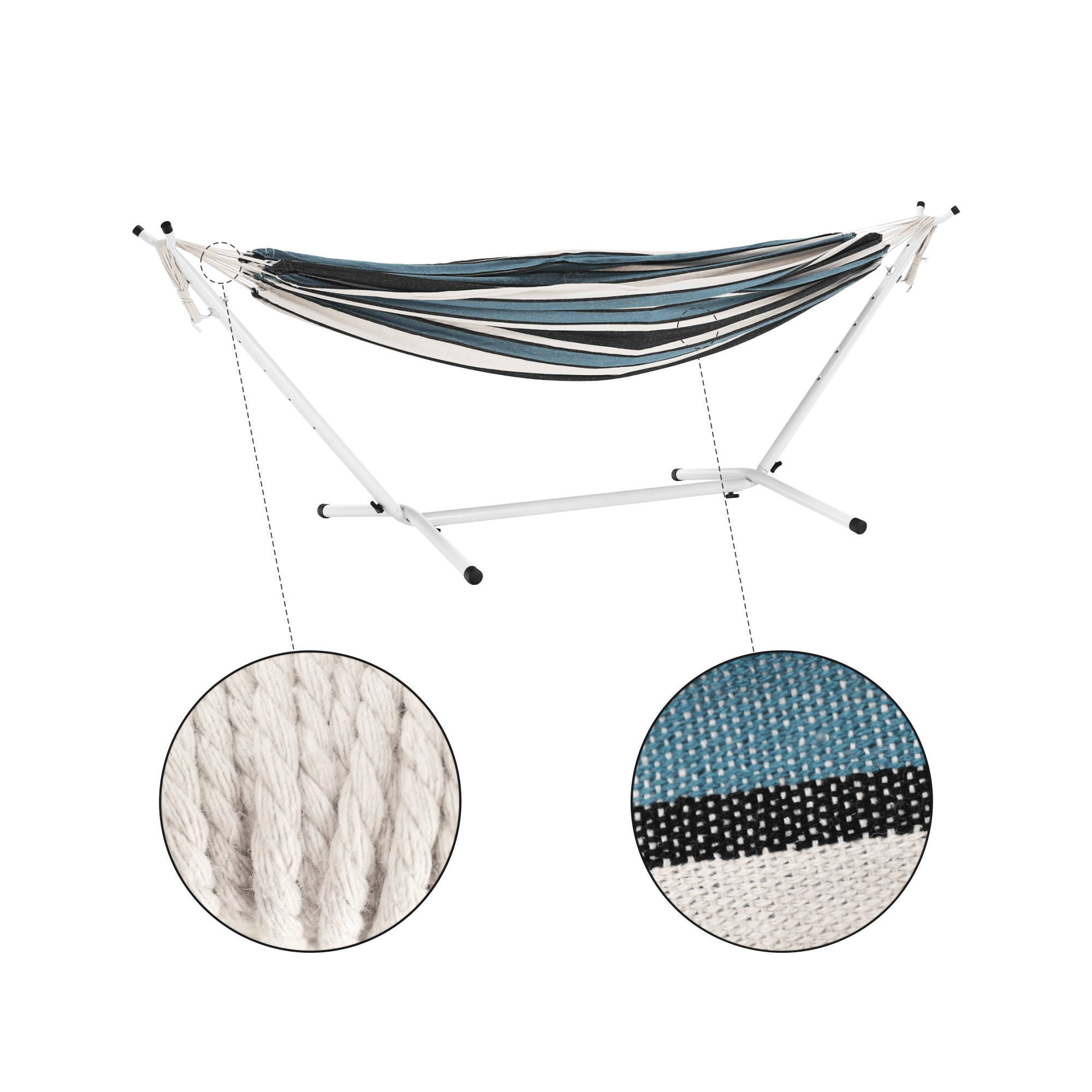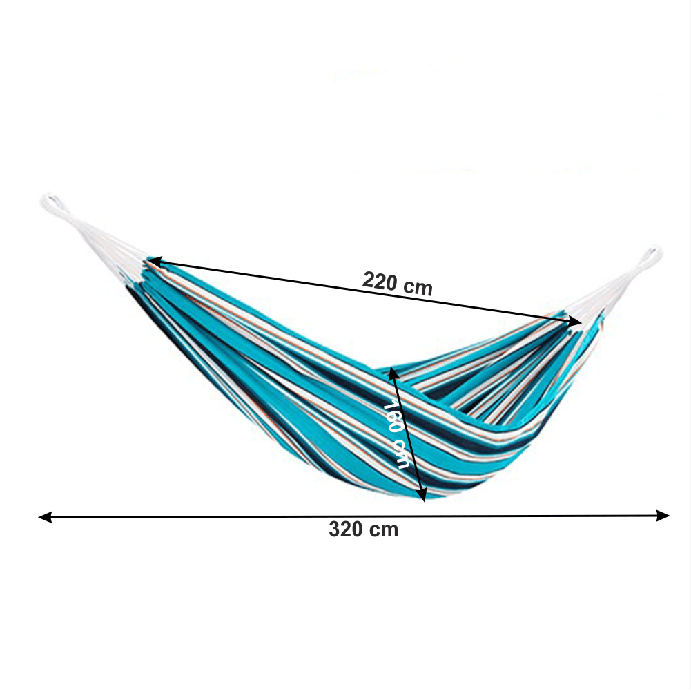 Materiál sítě: 50% bavlna / 50% polyester Barva: vzor modrý proužek Rozměry (ŠxD): 160x220 cm Celková délka: 320 cm Nosnost: 200 kg Vhodná pro dvě osoby Vhodná do interiéru a extriéru Možnost různorodého zavěšení Dodávané v demontu Dodávané bez stojanu
