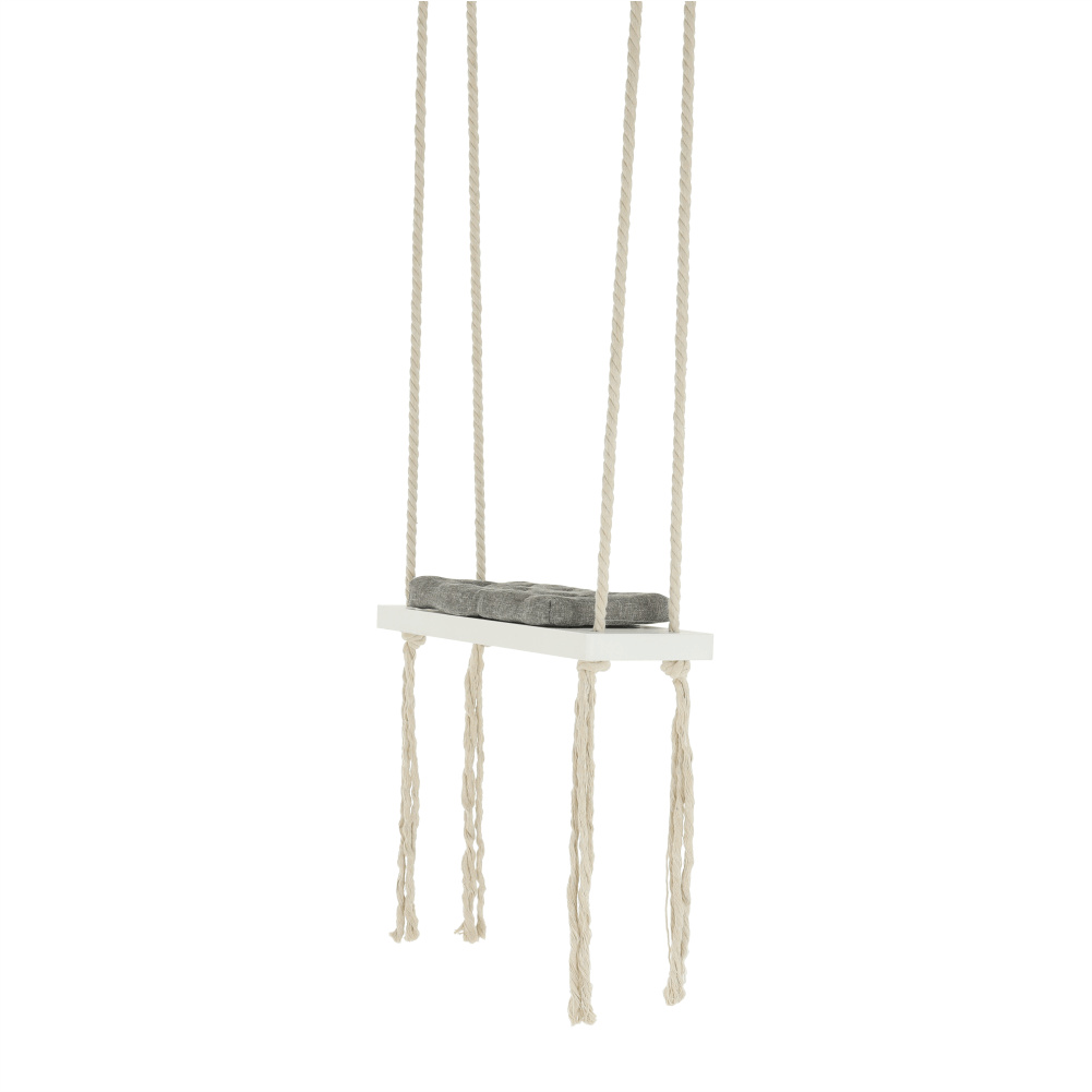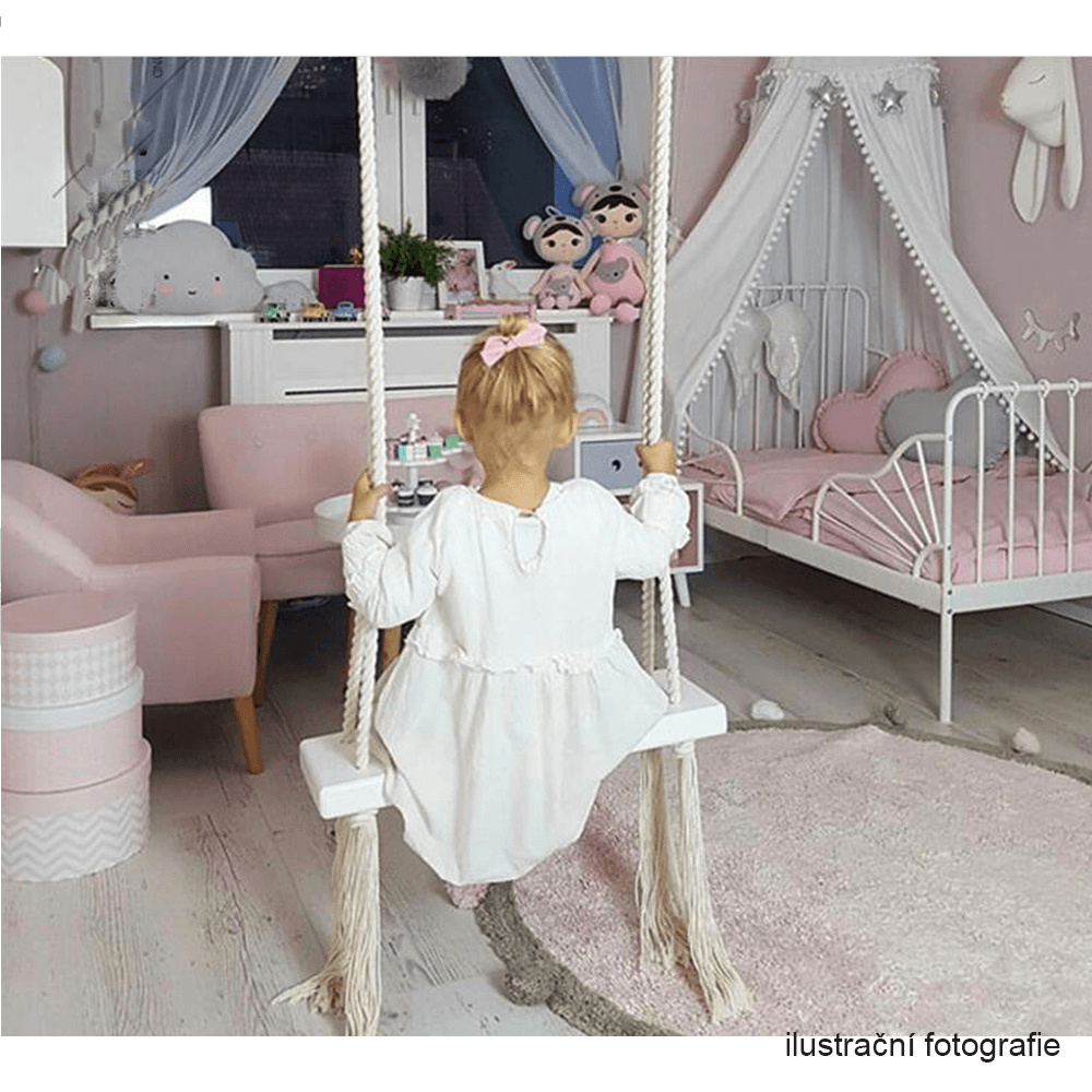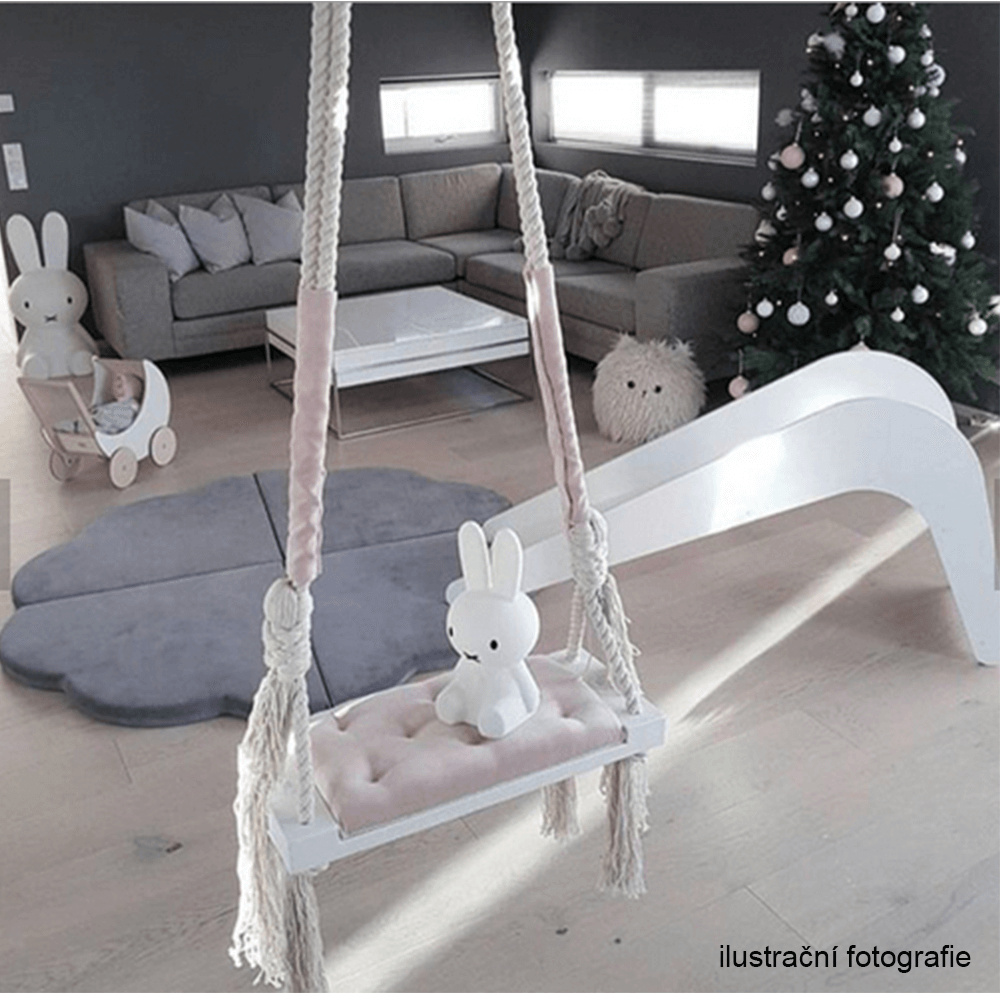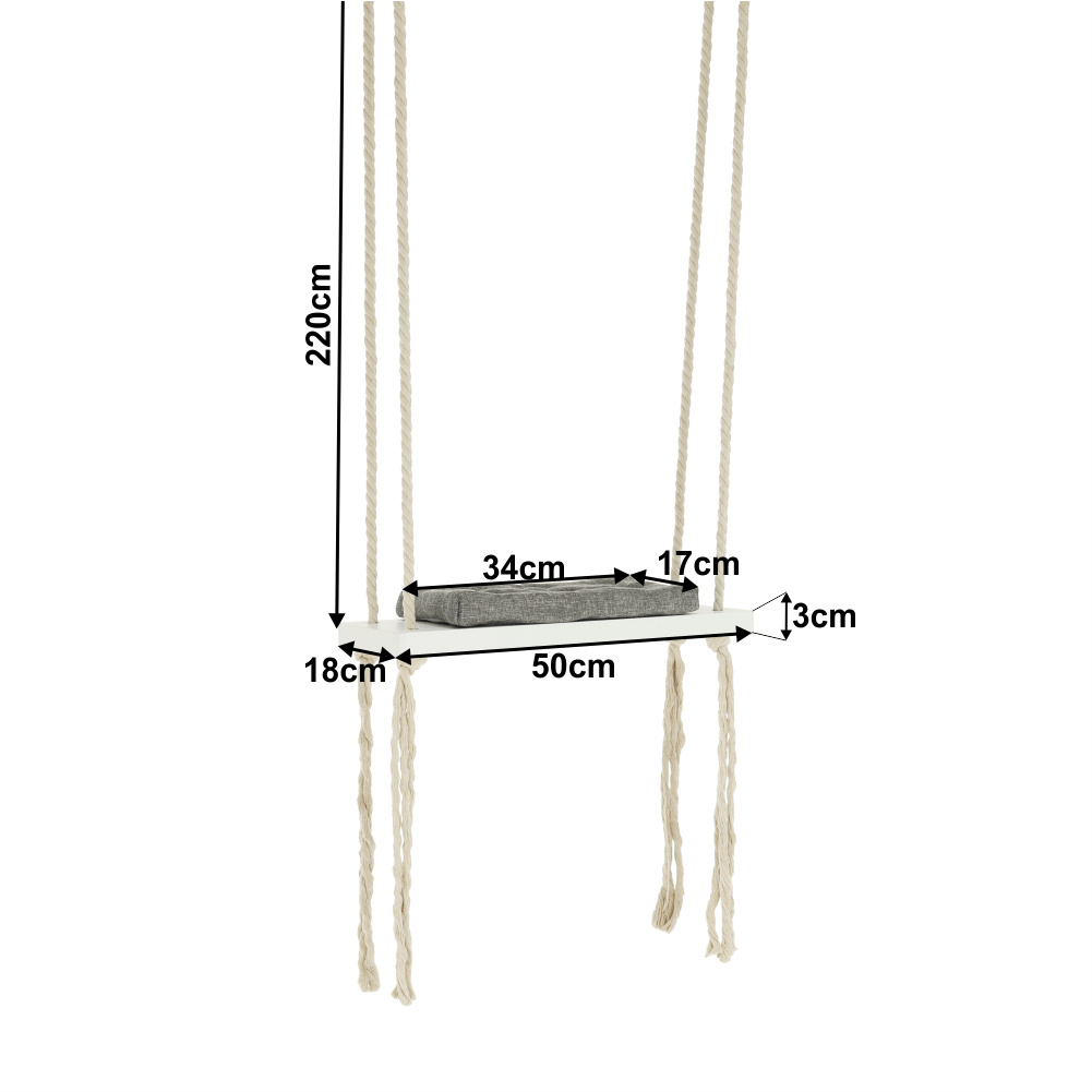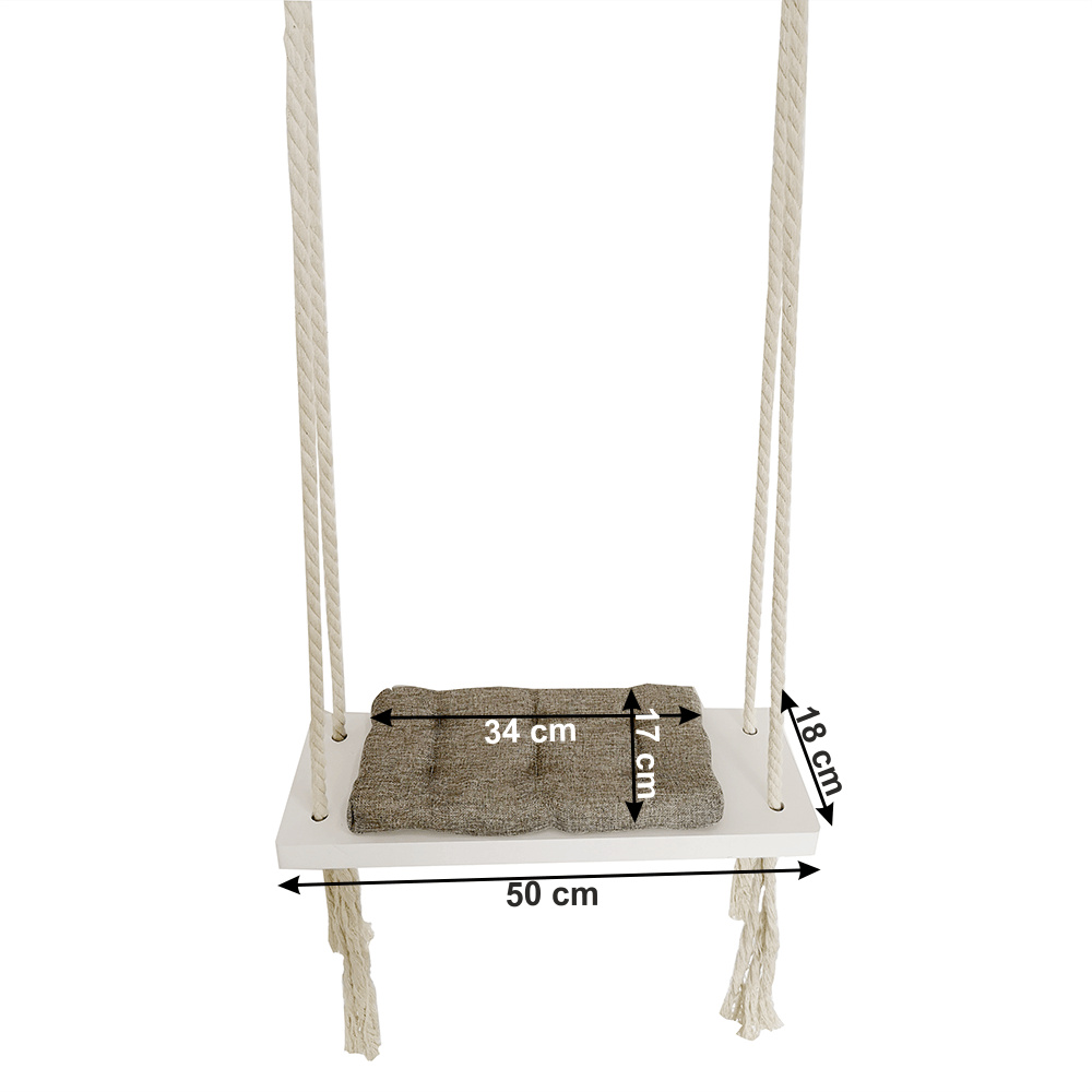 Materiál konstrukce: dřevo / lano Barva: bílá Materiál polštář: látka Barva: šedá Rozměry houpačka (ŠxHxV): 50x18x3 cm Rozměry polštář (ŠxHxV): 34x17x4 cm Polštář se suchým zipem snímatelný Doporučujeme prát ručně při max. 40 ° Nebělit, nečistit chemicky Neždímat, polštář tak může ztratit tvar Nosnost: 60 kg Kování na zavěšení součástí balení Vhodná pro děti od 4 let Pro děti pod dozorem dospělého Vhodná do interiéru Moderní zpracování Dodávané v demontu