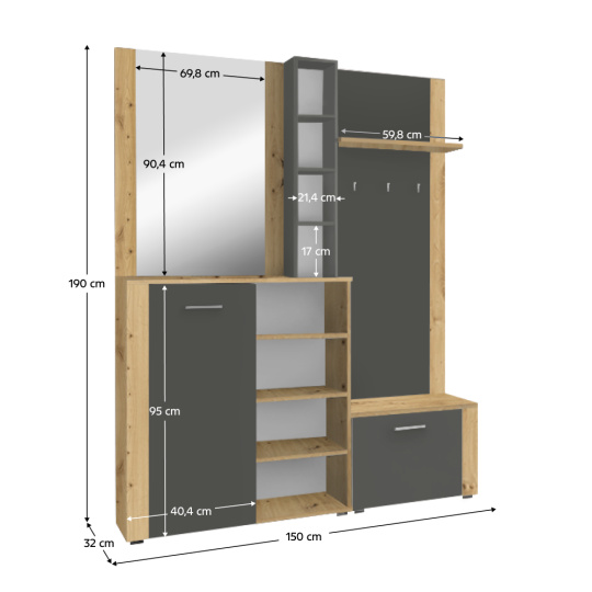 Materiál: laminovaná DTD Barva: dub artisan/grafit Rozměry (ŠxHxV): 150x32x190 cm Botník Zrcadlo Rozměry zrcadla (ŠxHxV): 69,8x1,9x90,4 cm Otevřený úložný prostor Skříňka s policemi Rozměry skříňky (ŠxV): 40,4x95 cm Police Dva háčky Nosnost háčku: 1 kg Plastové úchytky Barva úchytek: stříbrná Doporučujeme připevnit ke stěně Dodáváno v demontu