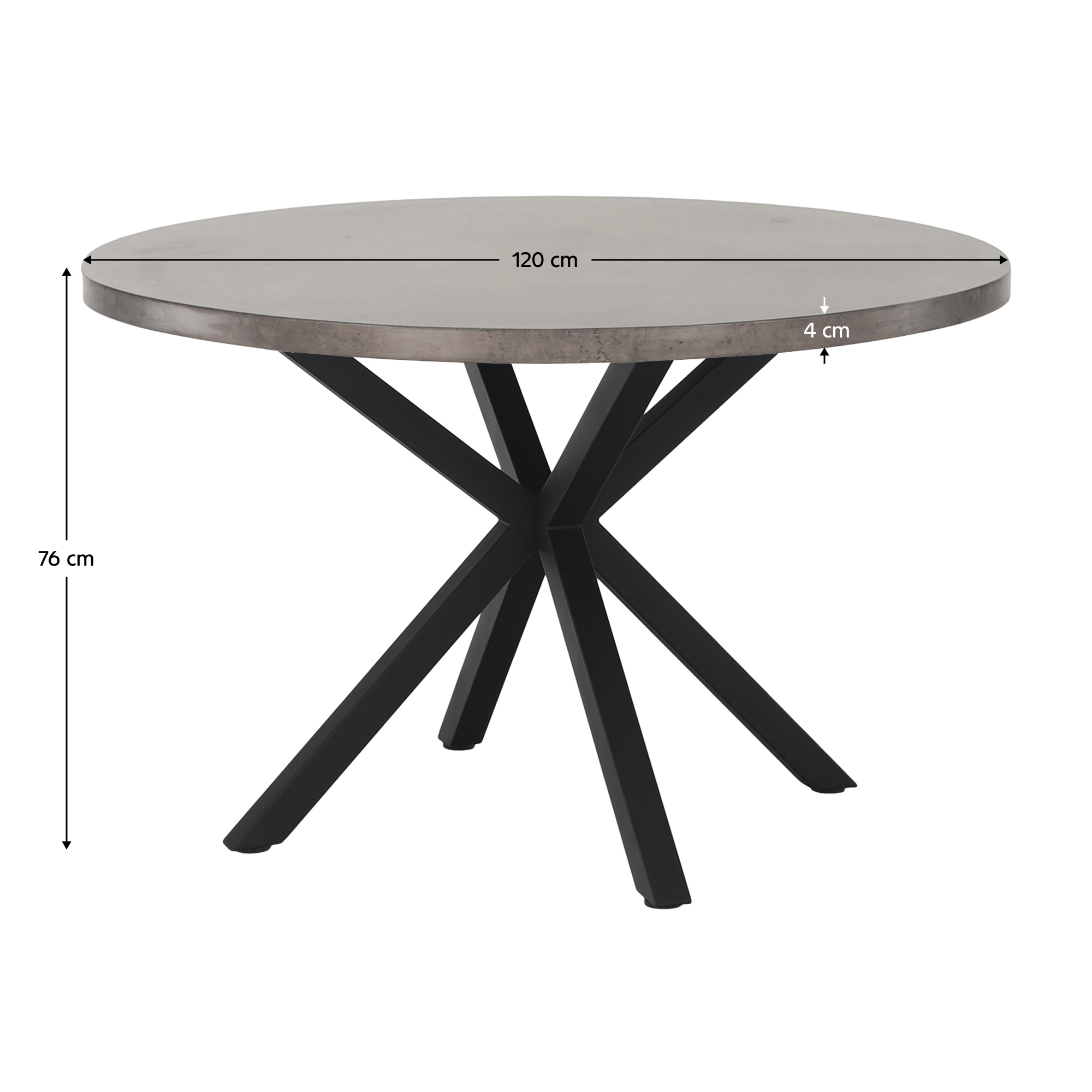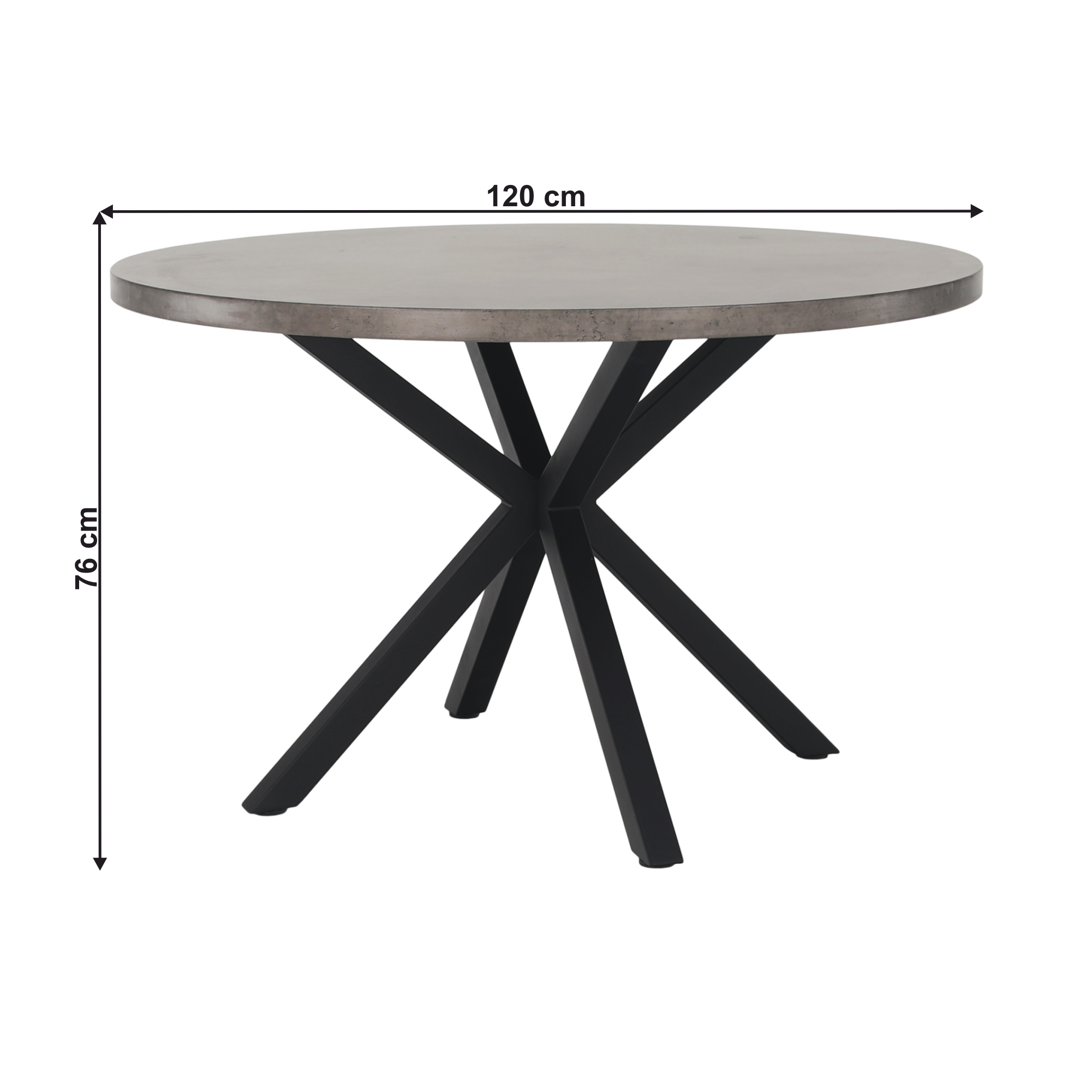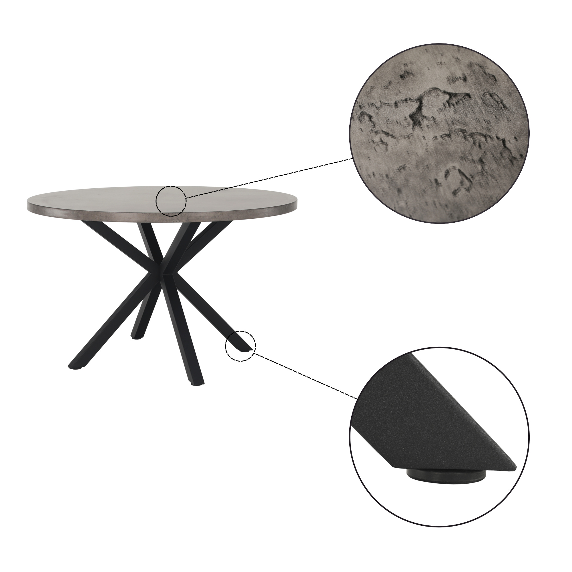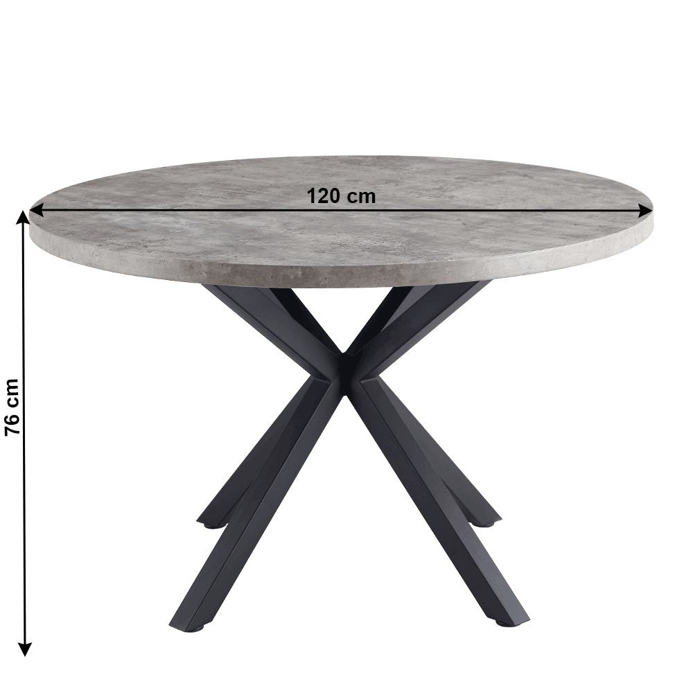 Jedálenský stůl MEDOR Ukradený materiál: MDF Farba: beton Konstrukce nohy: kov Farba: čierna Rozmery PxV: 120x76 cm Tloušťka vrchního plátu: 4 cm Okrúhly Průmyslová ocel Dodávané v demonte