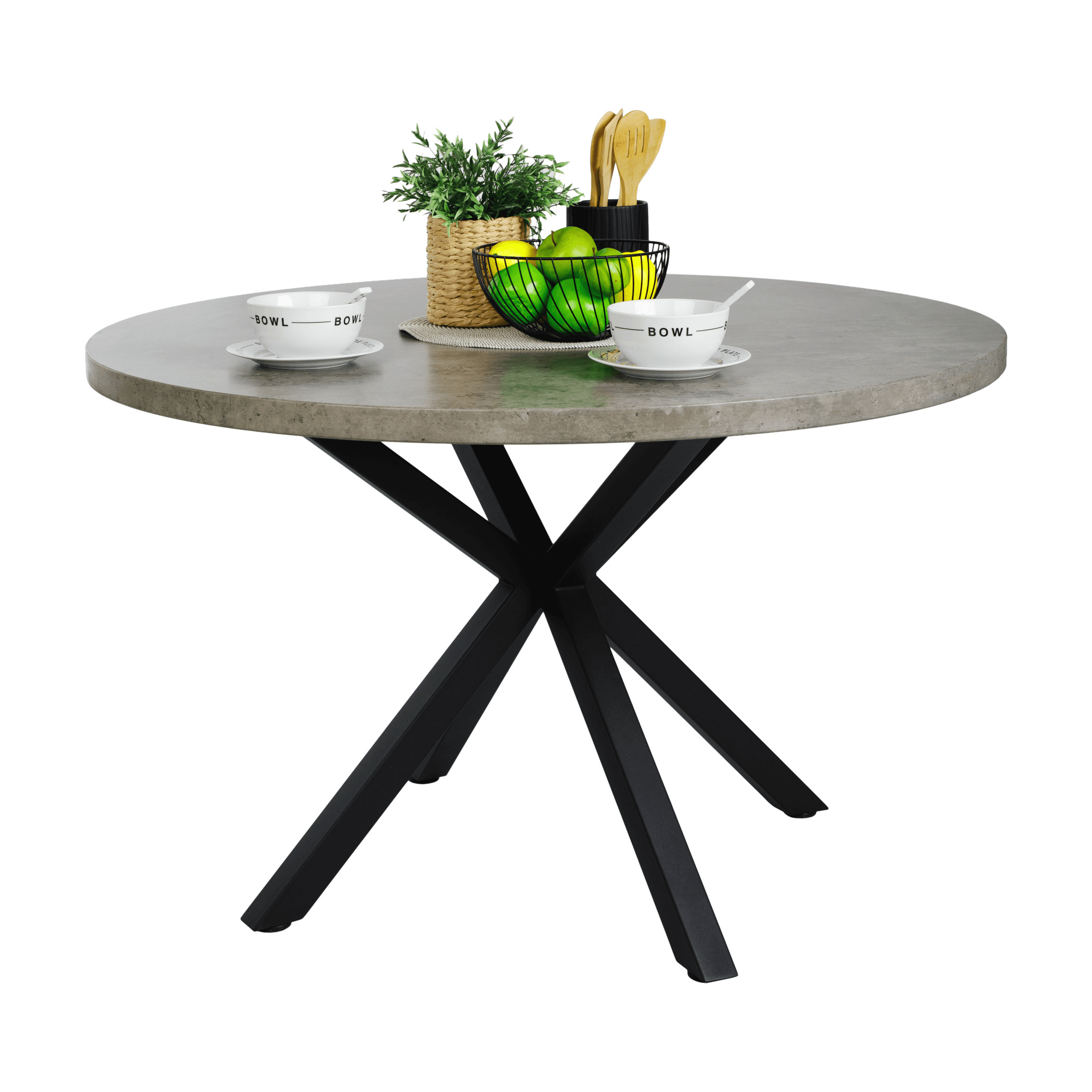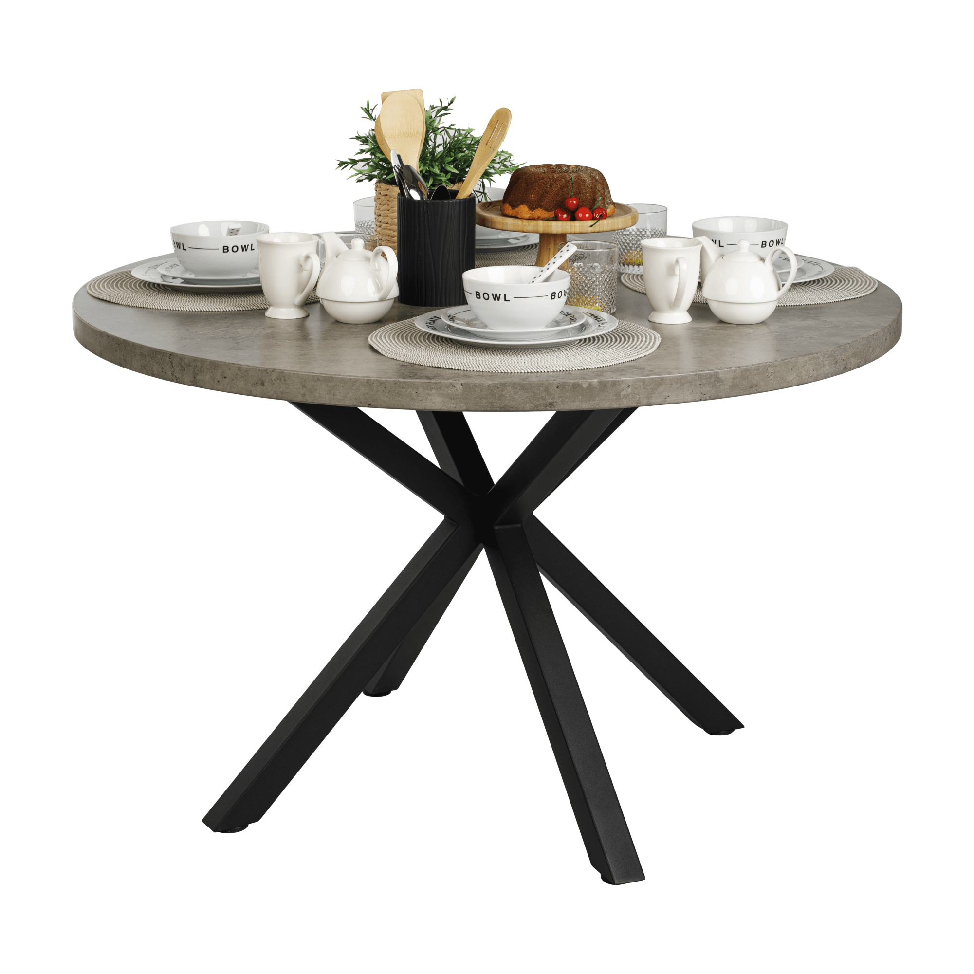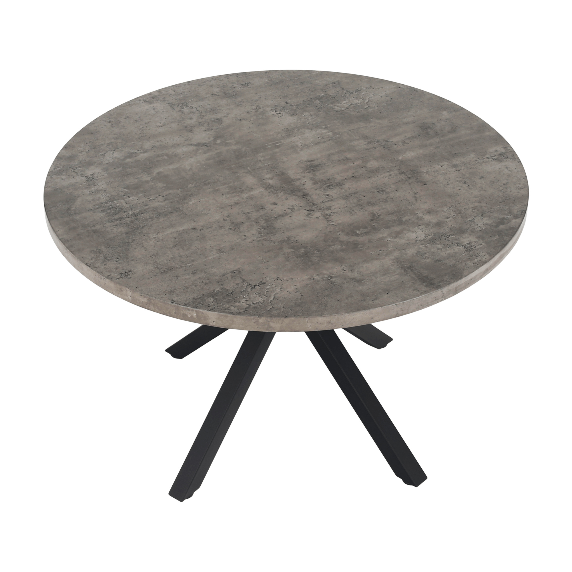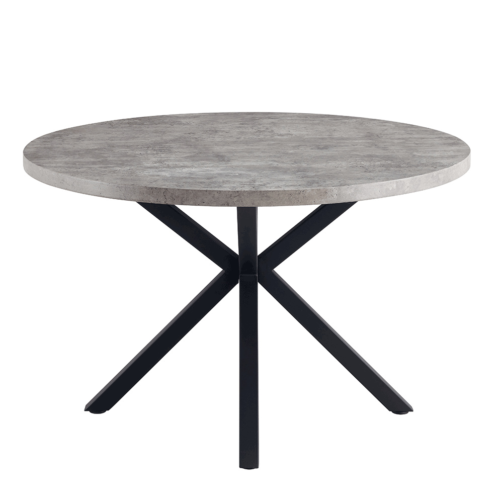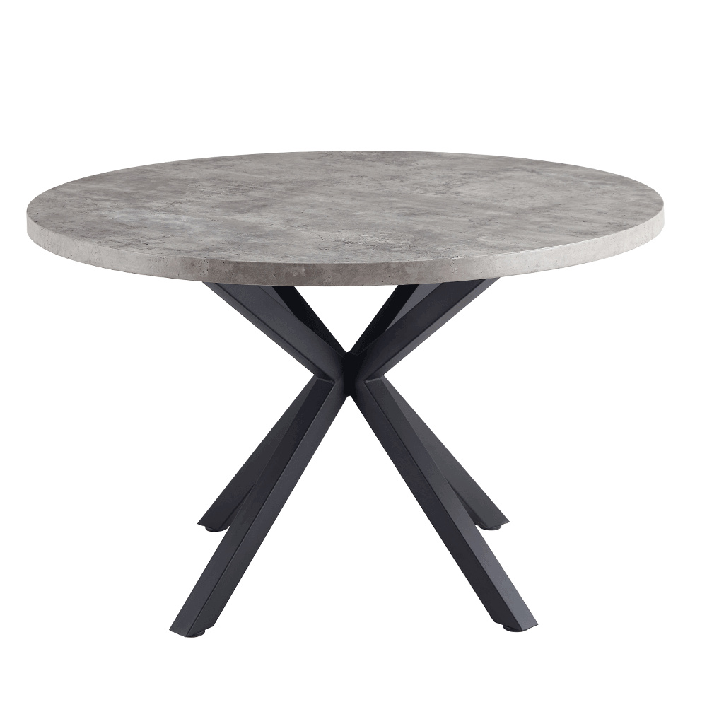 Jedálenský stůl MEDOR Ukradený materiál: MDF Farba: beton Konstrukce nohy: kov Farba: čierna Rozmery PxV: 120x76 cm Tloušťka vrchního plátu: 4 cm Okrúhly Průmyslová ocel Dodávané v demonte