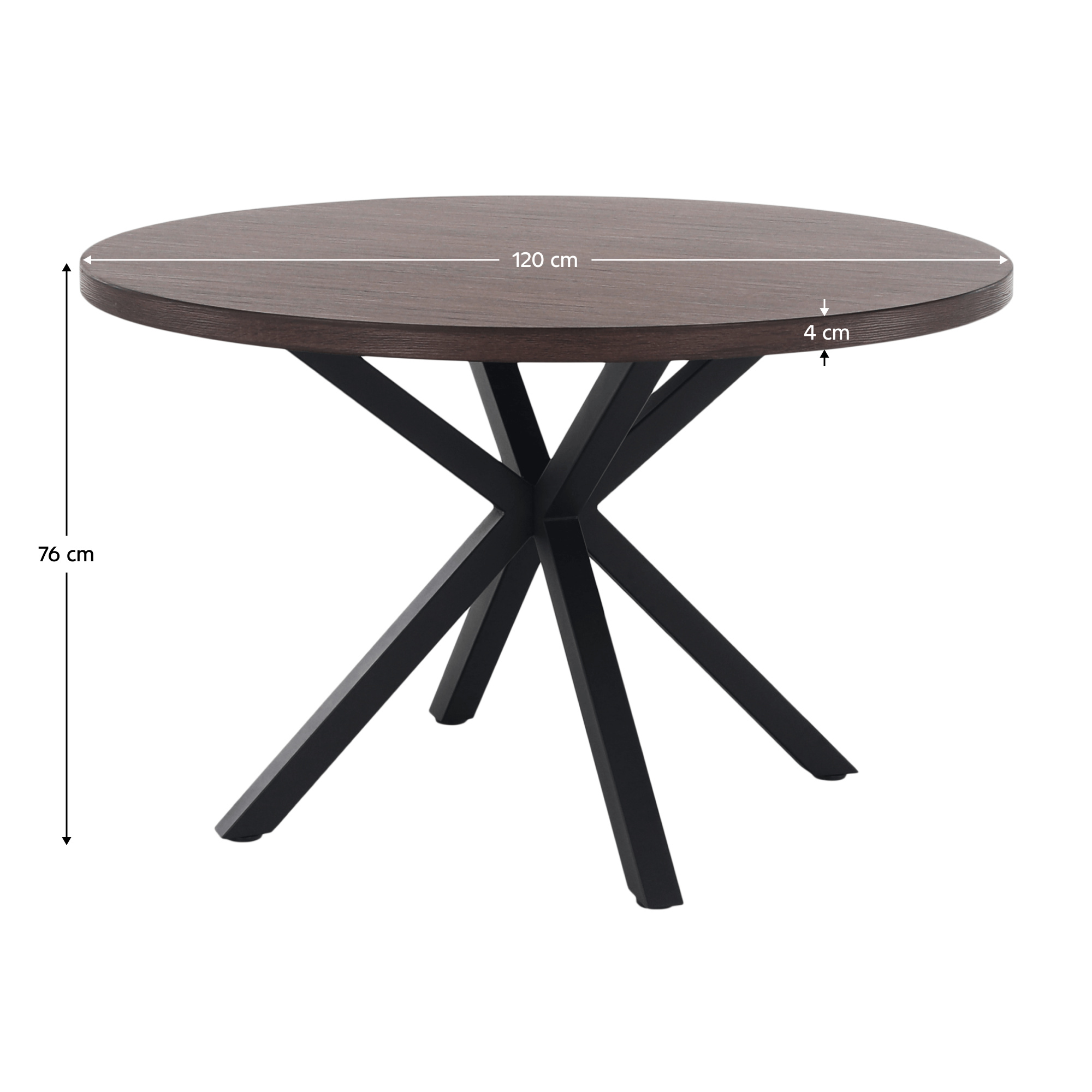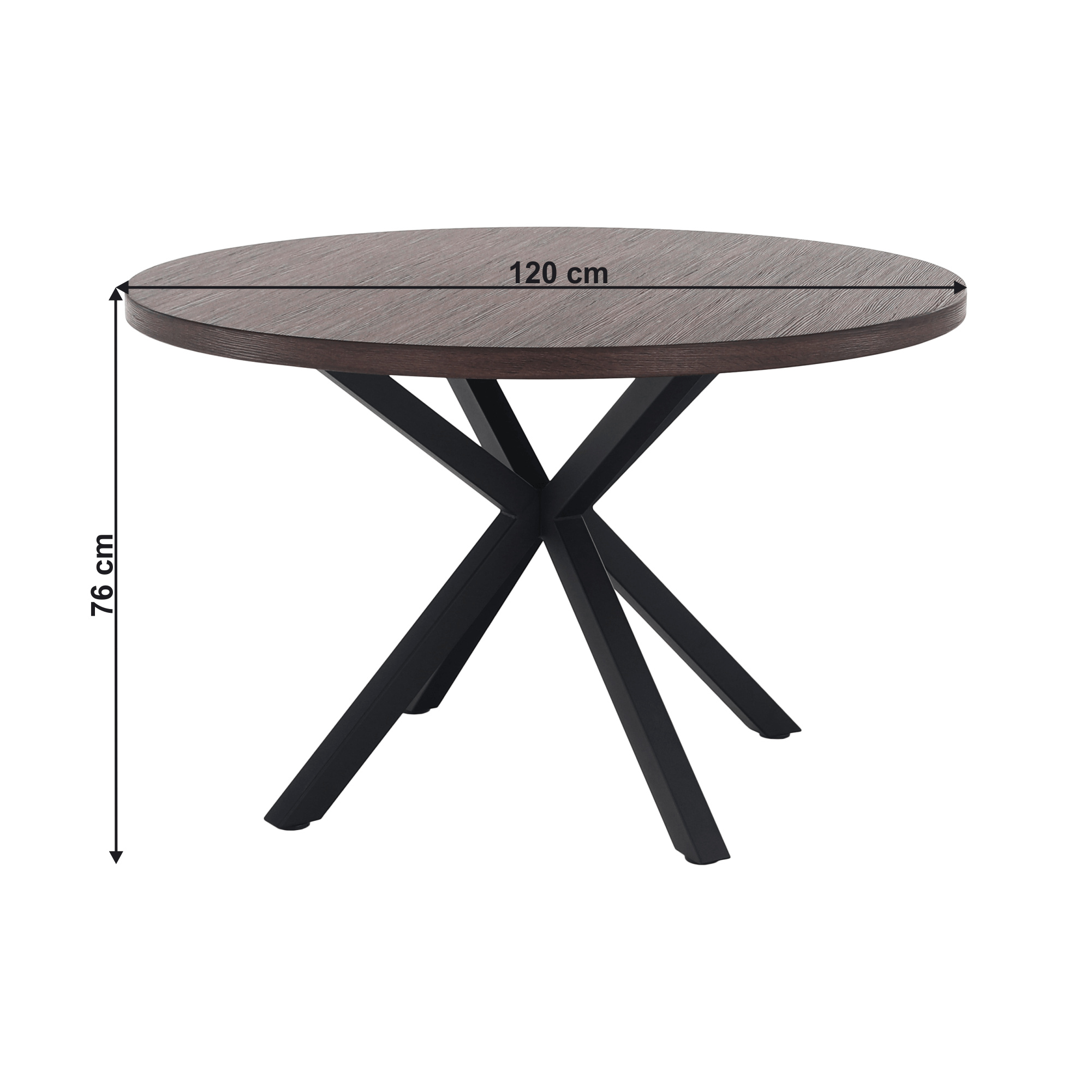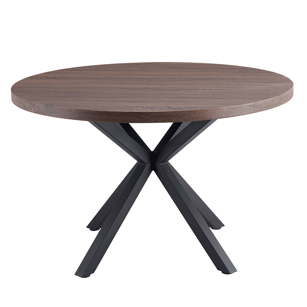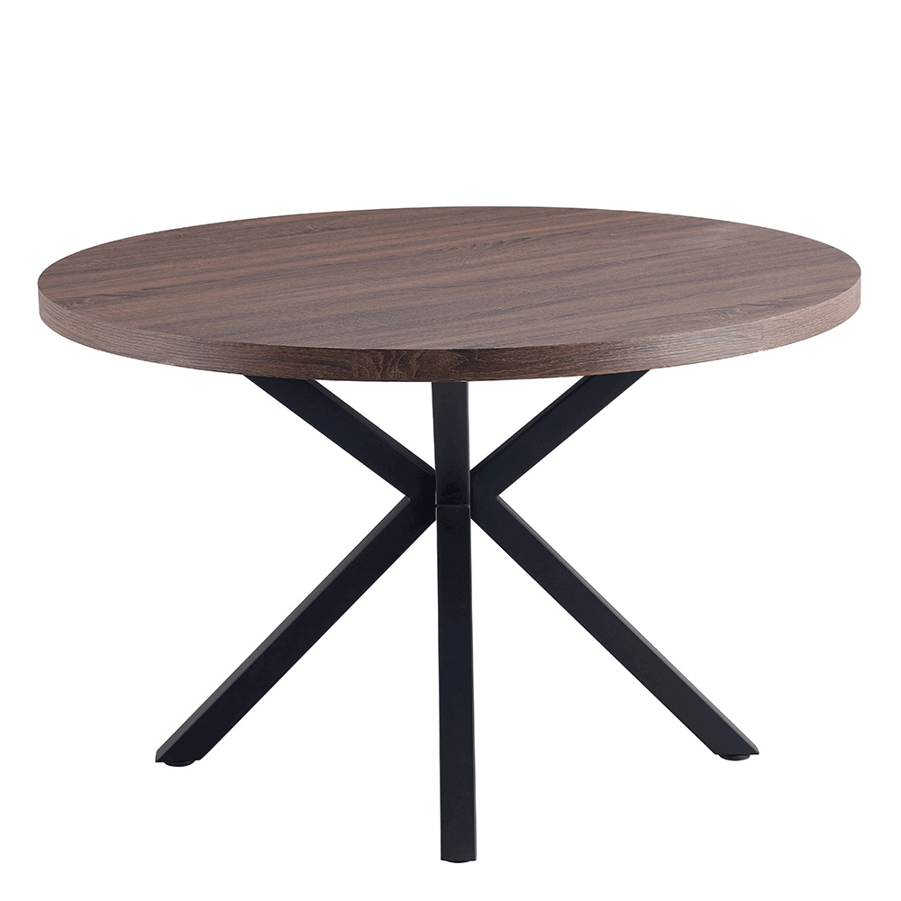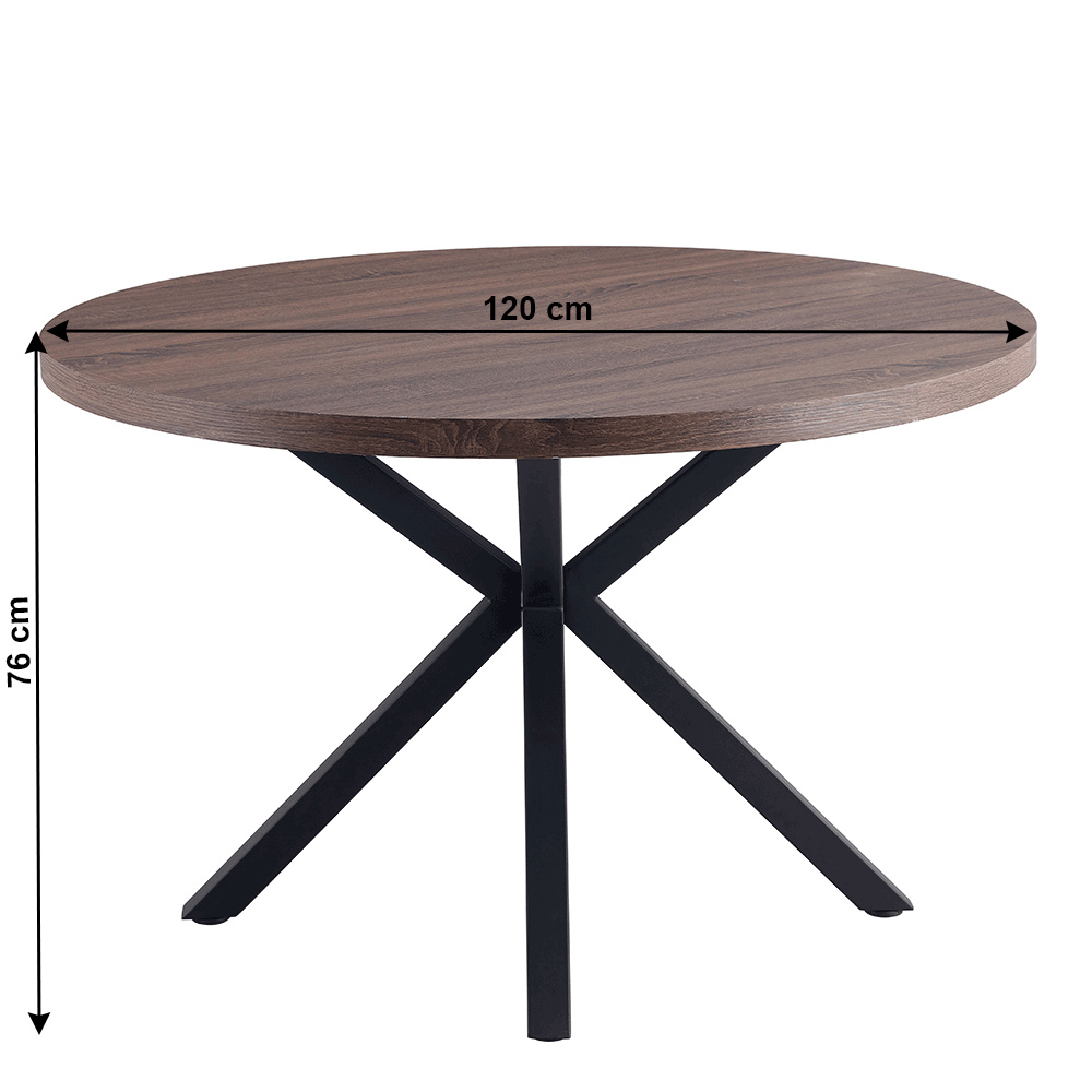 Jedálenský stůl MEDOR Ukradený materiál: MDF Farba: tmavý dub Konstrukce nohy: kov Farba: čierna Rozmery PxV: 120x76 cm Tloušťka vrchního plátu: 4 cm Okrúhly Průmyslová ocel Dodávané v demonte