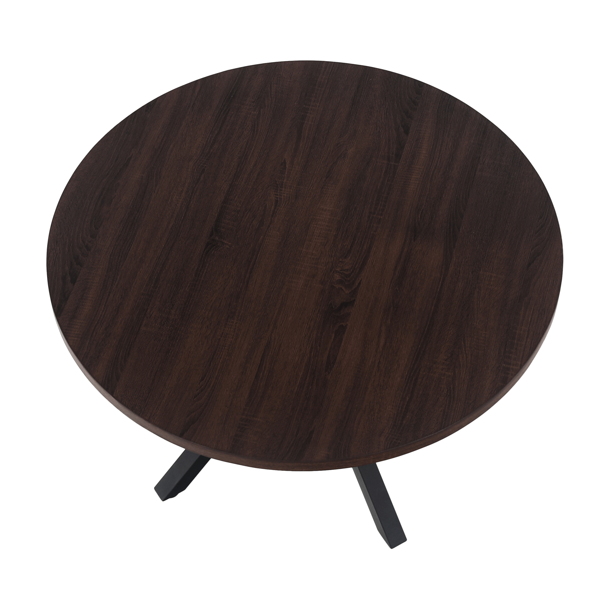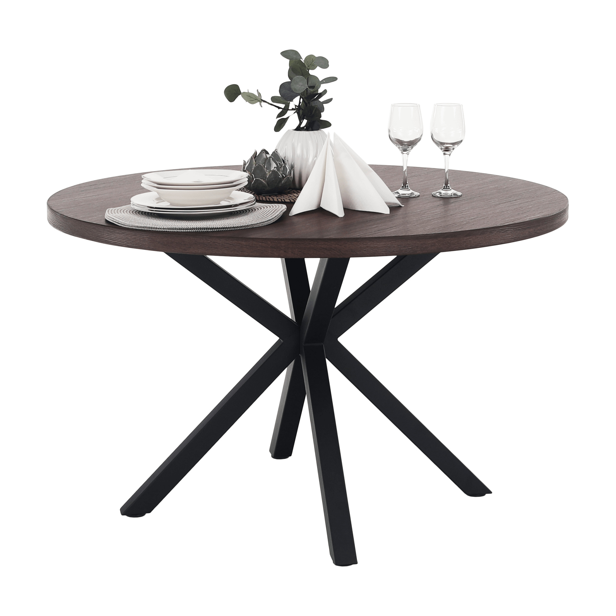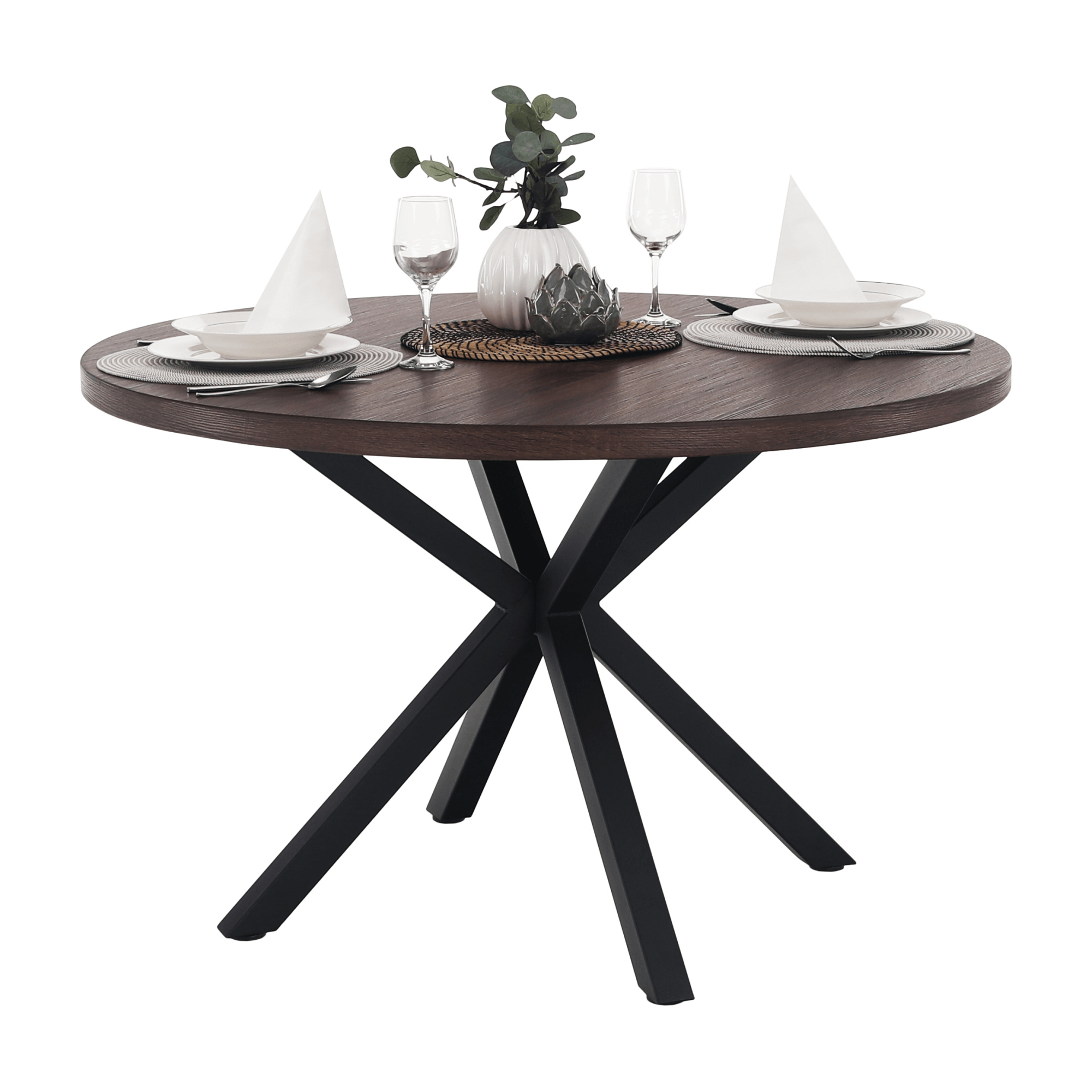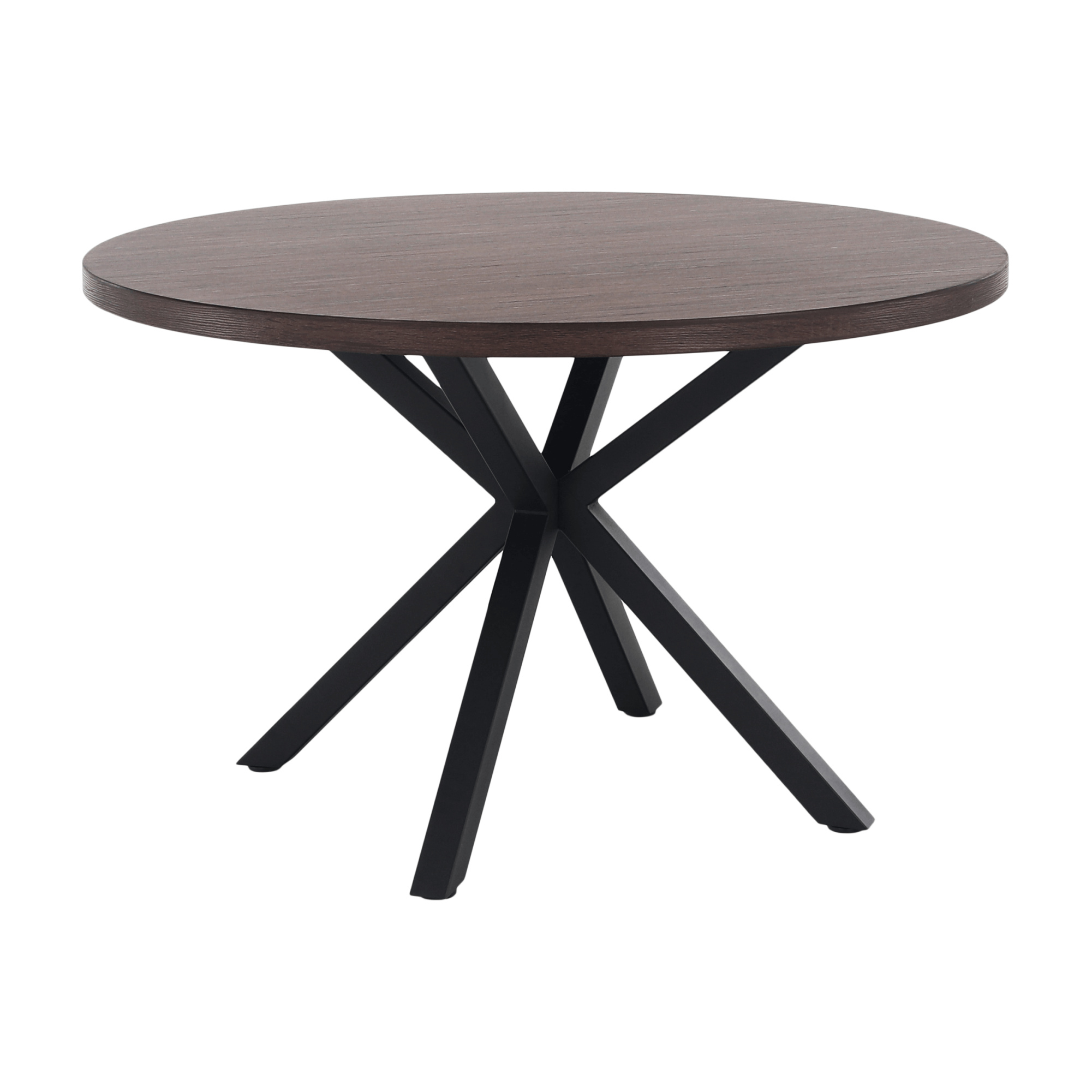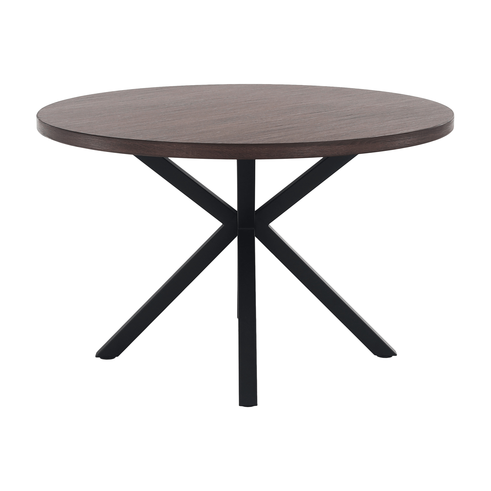 Jedálenský stůl MEDOR Ukradený materiál: MDF Farba: tmavý dub Konstrukce nohy: kov Farba: čierna Rozmery PxV: 120x76 cm Tloušťka vrchního plátu: 4 cm Okrúhly Průmyslová ocel Dodávané v demonte