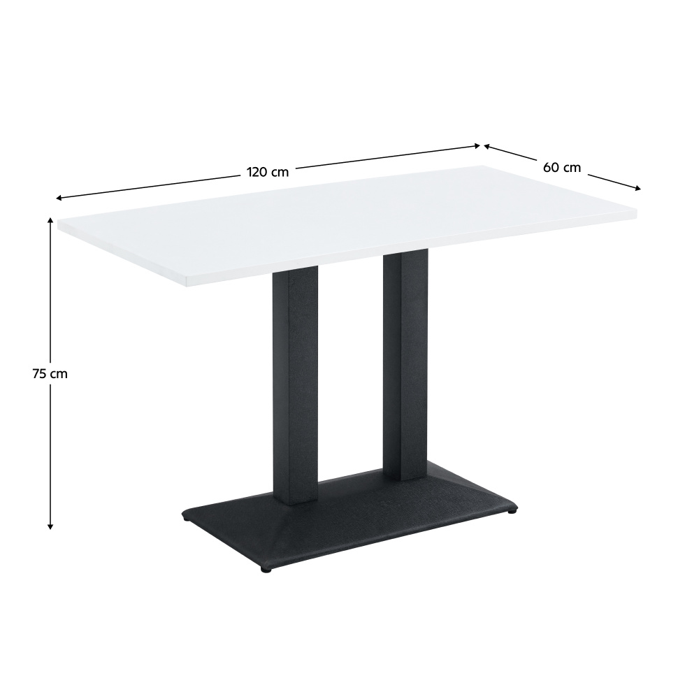 Materiál: DTD laminovaná/kov Barva: bílá/černá Rozměry (ŠxHxV): 120x60x75 cm Hmotnost: 21 kg Tloušťka materiálu: 2,3 cm Nosnost: 60 kg Kovová podstava Moderní design Stůl typu: bistro Dodáváno v demontu
