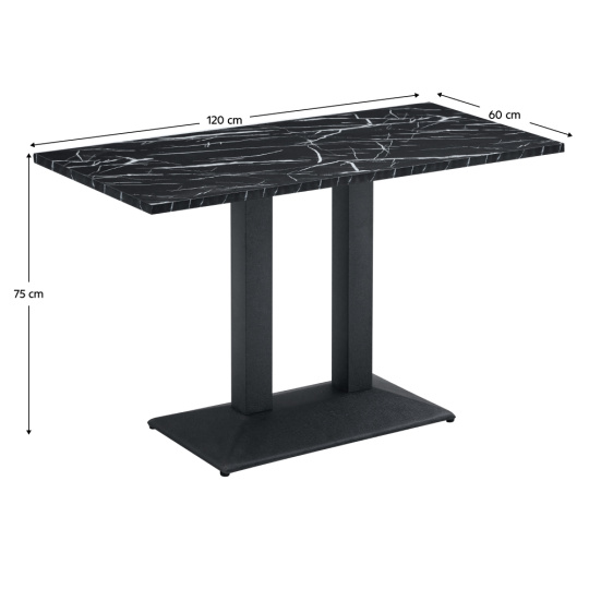 Materiál: DTD laminovaná/kov Barva: vzor černý mramor/černá Rozměry (ŠxHxV): 120x60x75 cm Tloušťka materiálu: 2,3 cm Nosnost: 60 kg Hmotnost: 21 kg Kovová podstava Moderní design Stůl typu: bistro Dodáváno v demontu