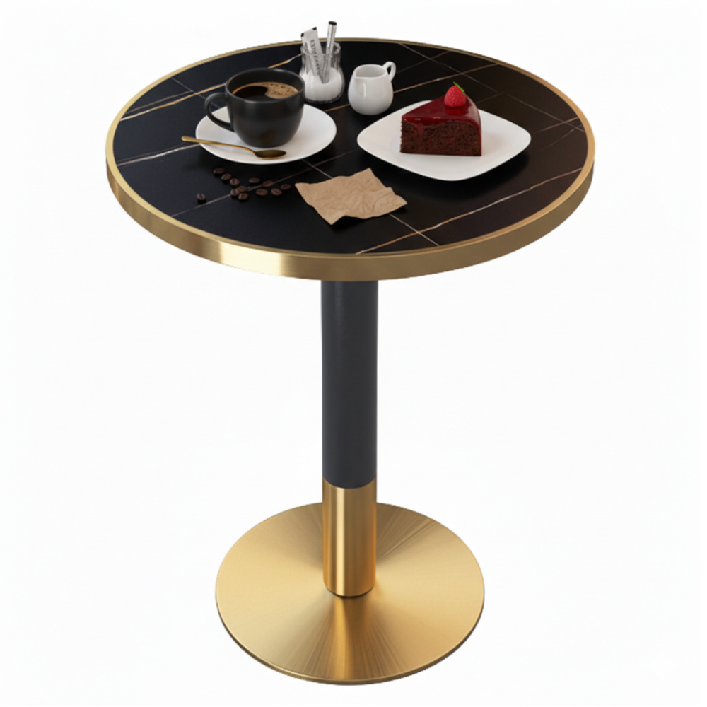 Materiál: akrylová deska/kov Barva: vzor černý mramor/černá/zlatá Rozměry (PxV): 80x75 cm Tloušťka materiálu: 1,1 cm Nosnost: 90 kg Stůl typu: bistro Kovová podstava Průměr podstavy: 60 cm Moderní design Kulatý tvar Dodáváno v demontu