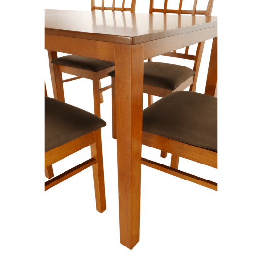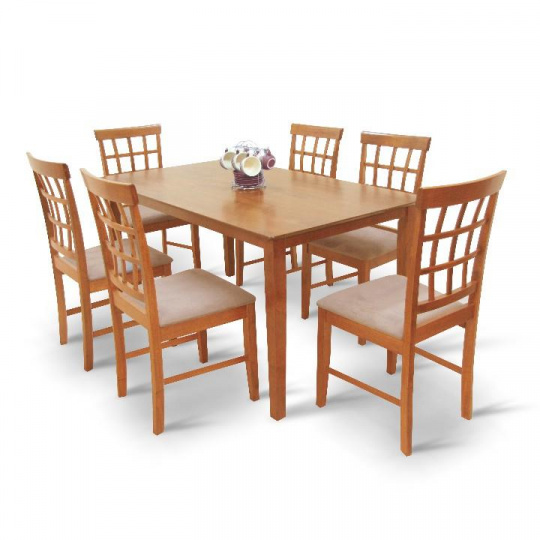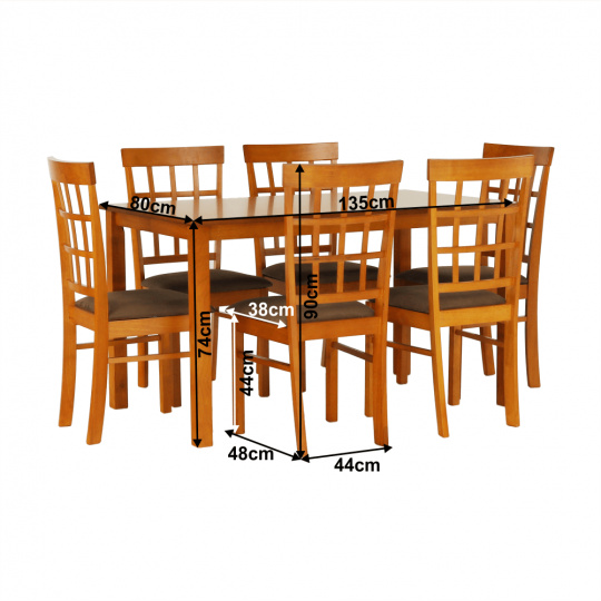 Jídelní komplet 1 + 6 GRID NEW Materiál: MDF dýhovaná / dřevo / látka Oděruodolnost textilie podle testu Martindale: 80 000 oděrek Barva: třešeň / béžovohňedá Rozměry stůl (ŠxHxV): 135x80x74 cm Rozměry židle (ŠxHxV): 44x48x90 cm Nosnost židle 100 kg Nosnost stola: 100 kg Dodávané v demontu.