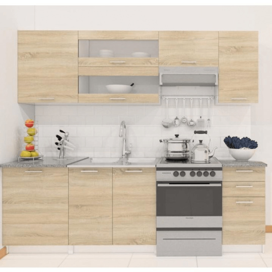 Kuchyňská sestava FABIANA Materiál: DTD laminovaná Barva: bílá/dub sonoma Rozměry (ŠxHxV): 240x46x154,4 cm Spodní část bez sporáku 180 cm Levá spodní skříňka (ŠxHxV): 60x46x82,4 cm Dvoudveřová spodní skříňka (ŠxHxV): 80x46x82,4 cm Spodní šuplíková skříňka (ŠxHvV): 40x46x82,4 cm Horní část 240 cm Jednodveřová horní skříňka sleva (ŠxHxV): 6