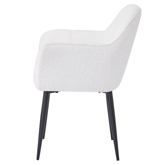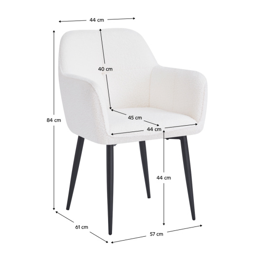 Materiál: látka Bouclé/kov Oděruodolnost textilie podle testu Martindale: 45 000 oděrů Barva: bílá/černá Rozměry (ŠxHxV): 57x61x84 cm Výška sedu: 44 cm Hloubka sedu: 45 cm Šířka sedu: 44 cm Šířka zádové opěrky: 44 cm Výška zádové opěrky: 40 cm Opěrky na ruce Dekorativně prošívané Designové Nosnost: 90 kg Dodáváno v demontu