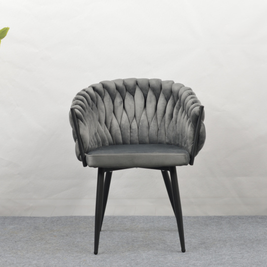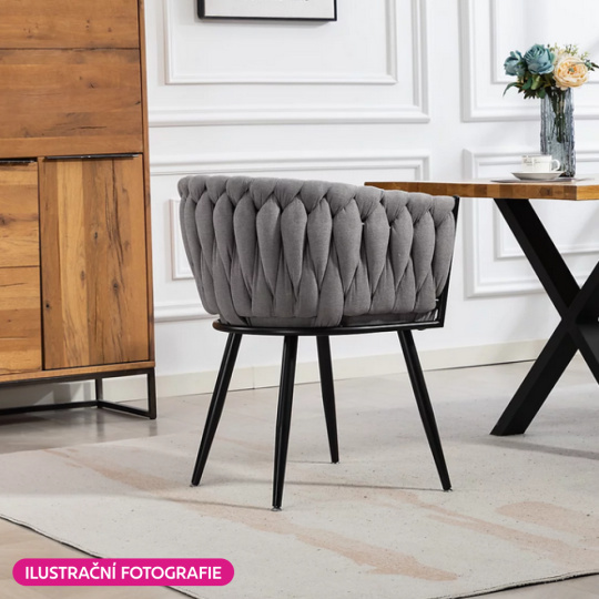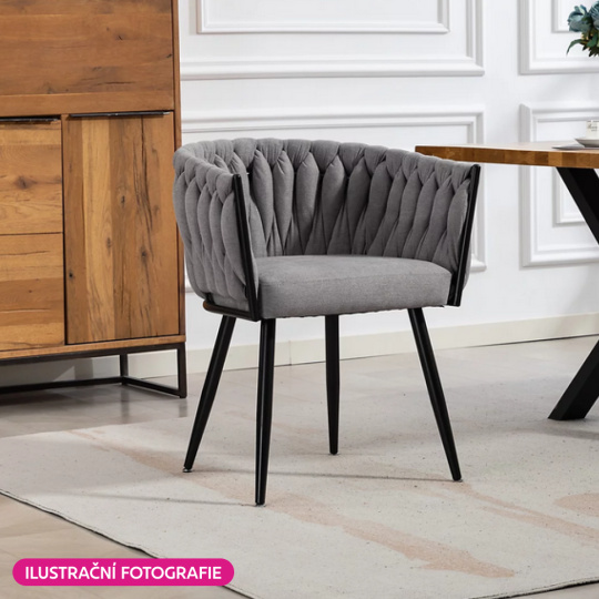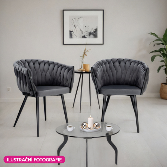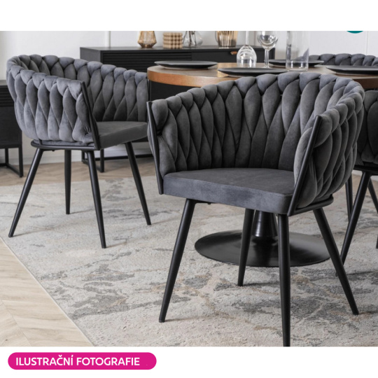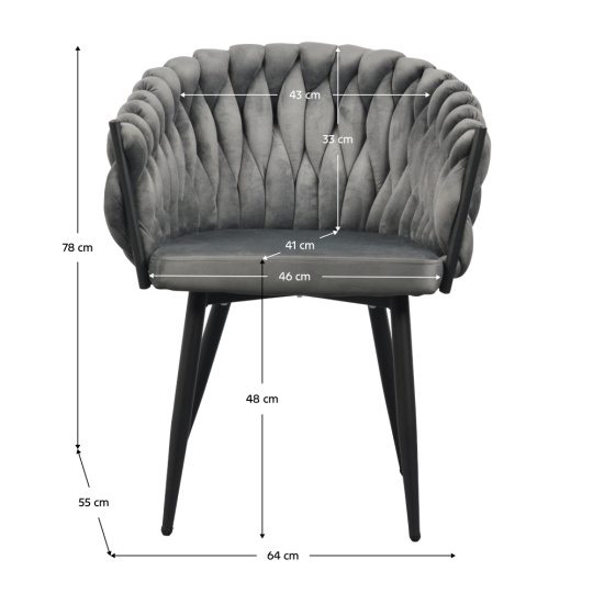 Materiál: látka Velvet/kov Oděruodolnost textilie podle testu Martindale: 80 000 oděrů Barva: tmavě šedá/černá Rozměry (ŠxHxV): 64x55x78 cm Výška sedu: 48 cm Hloubka sedu: 41 cm Šířka sedu: 46 cm Šířka zádové opěrky: 43 cm Výška zádové opěrky: 33 cm Nosnost: 100 kg Kovová konstrukce Designové Netradiční prošívání Dodáváno v demontu
