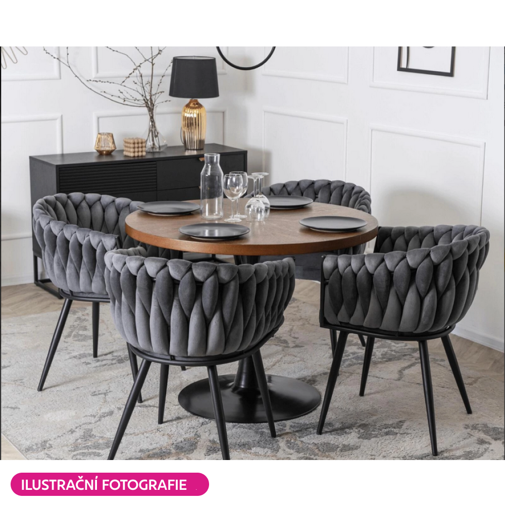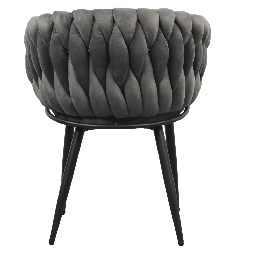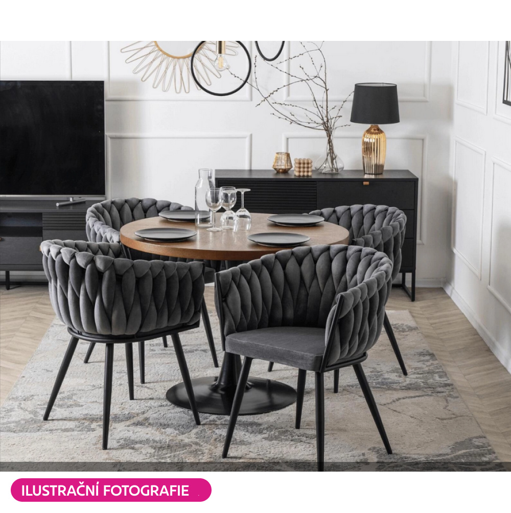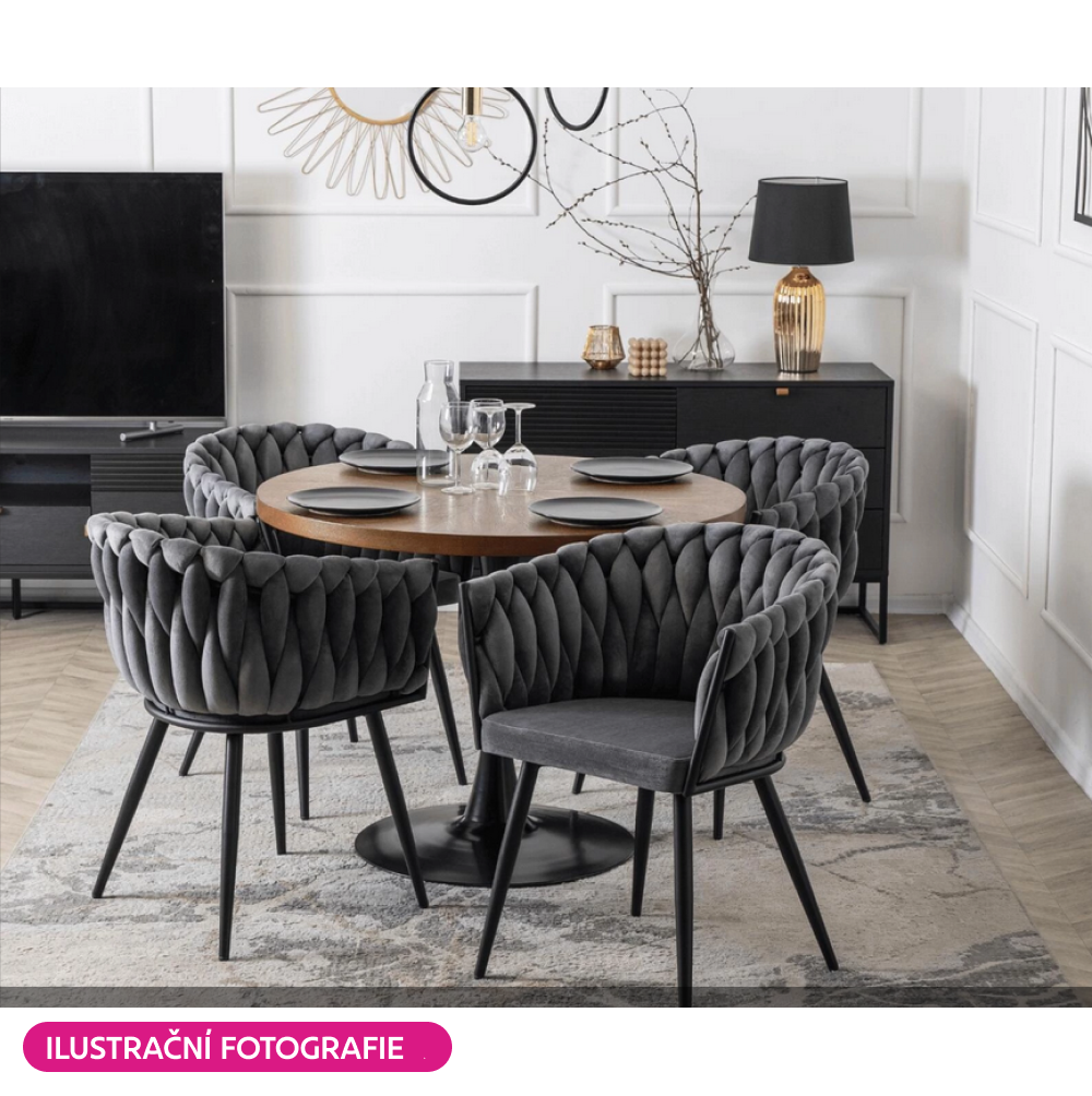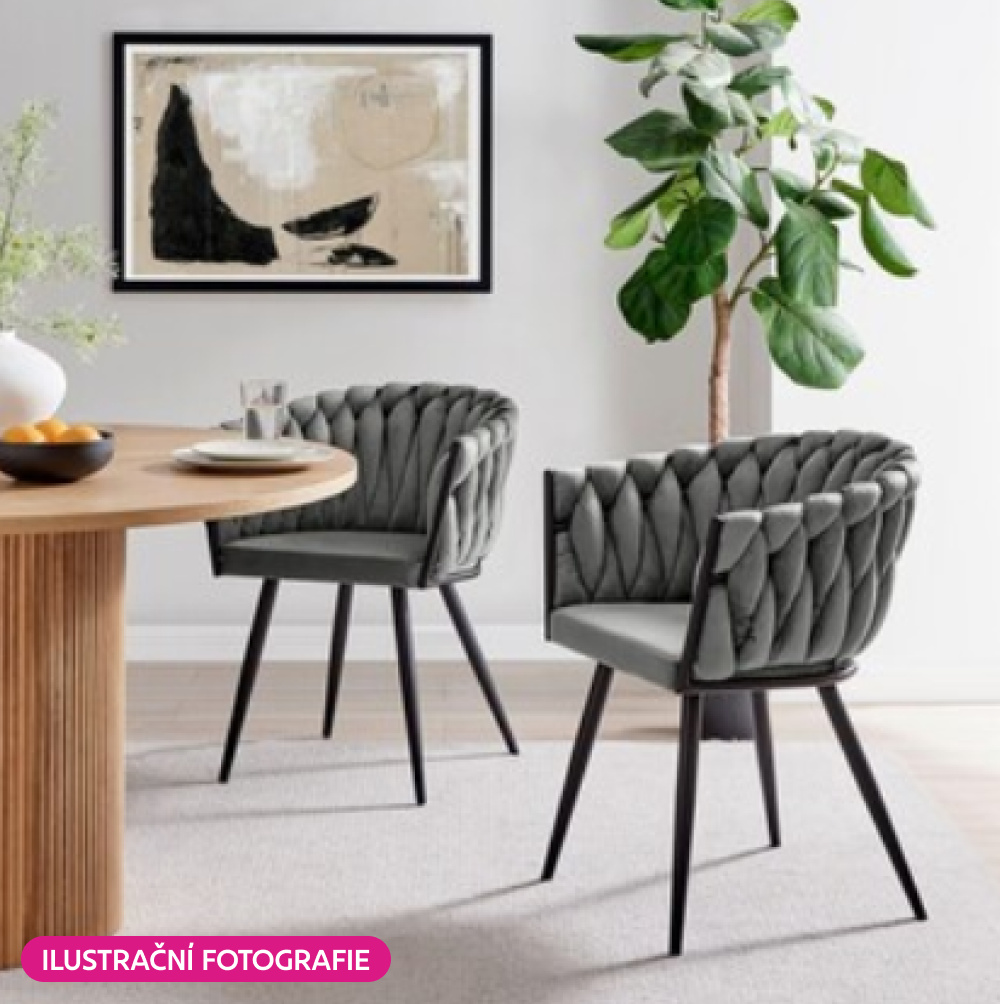 Materiál: látka Velvet/kov Oděruodolnost textilie podle testu Martindale: 80 000 oděrů Barva: tmavě šedá/černá Rozměry (ŠxHxV): 64x55x78 cm Výška sedu: 48 cm Hloubka sedu: 41 cm Šířka sedu: 46 cm Šířka zádové opěrky: 43 cm Výška zádové opěrky: 33 cm Nosnost: 100 kg Kovová konstrukce Designové Netradiční prošívání Dodáváno v demontu