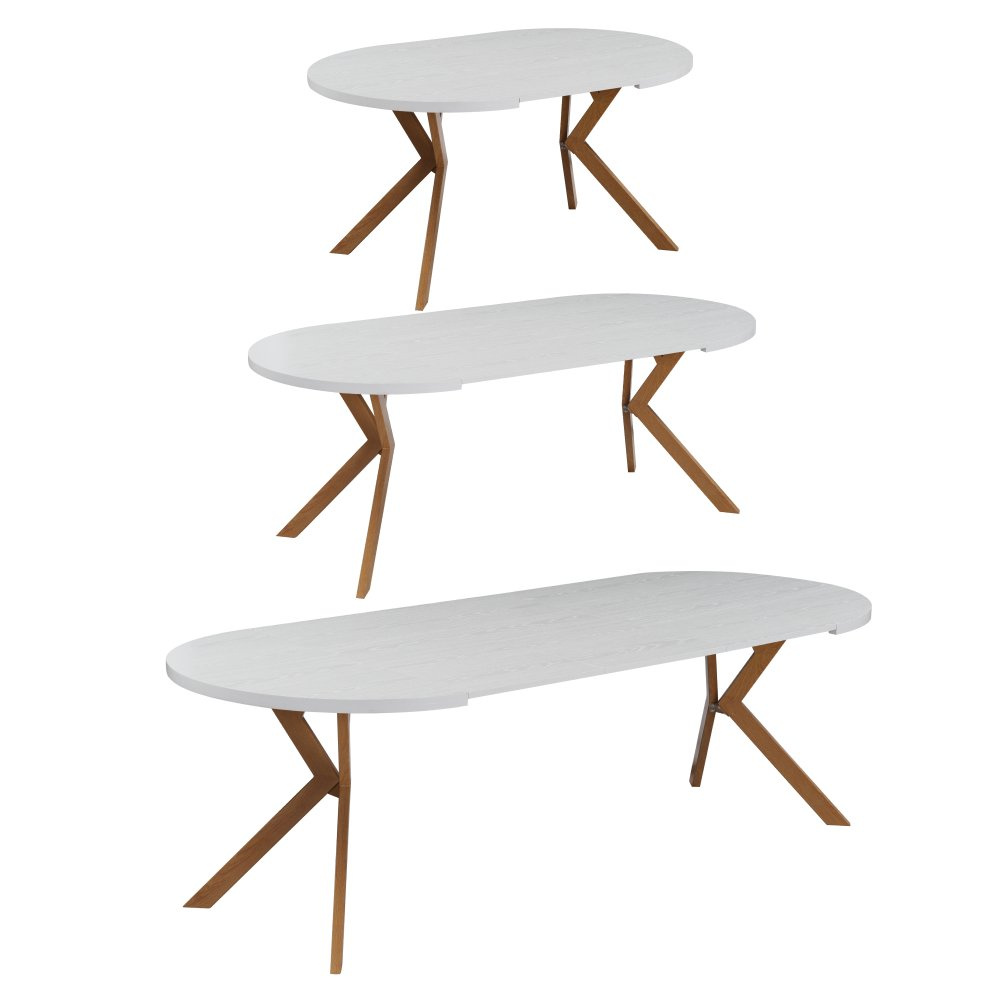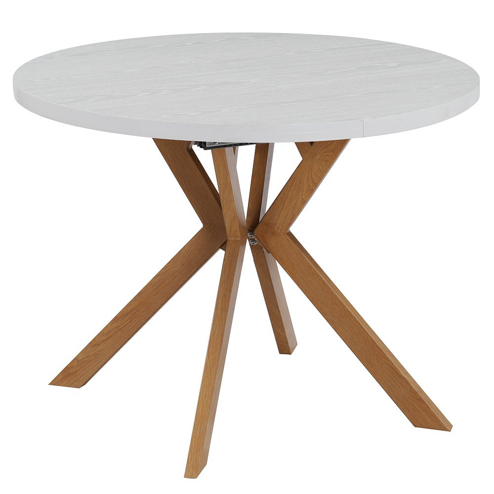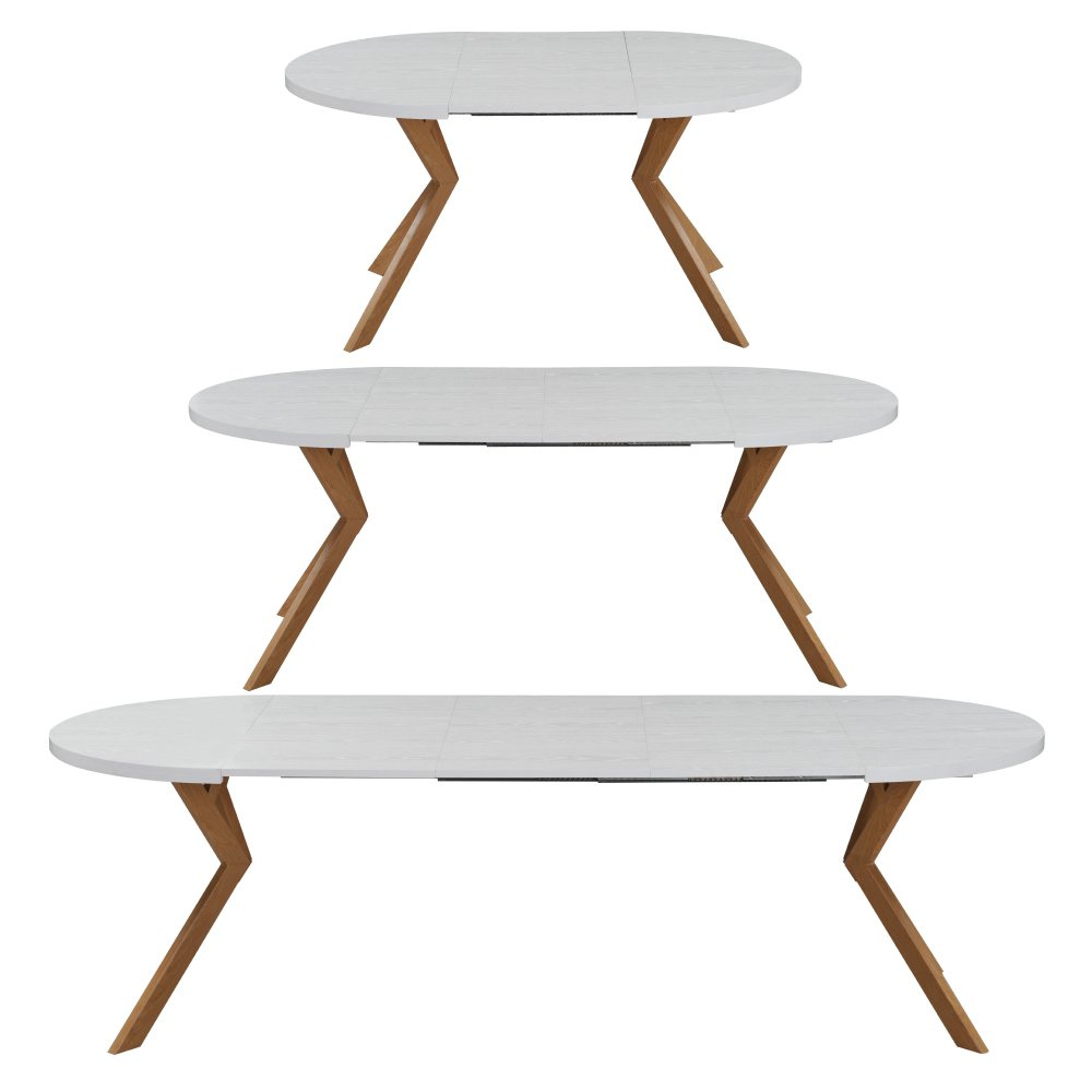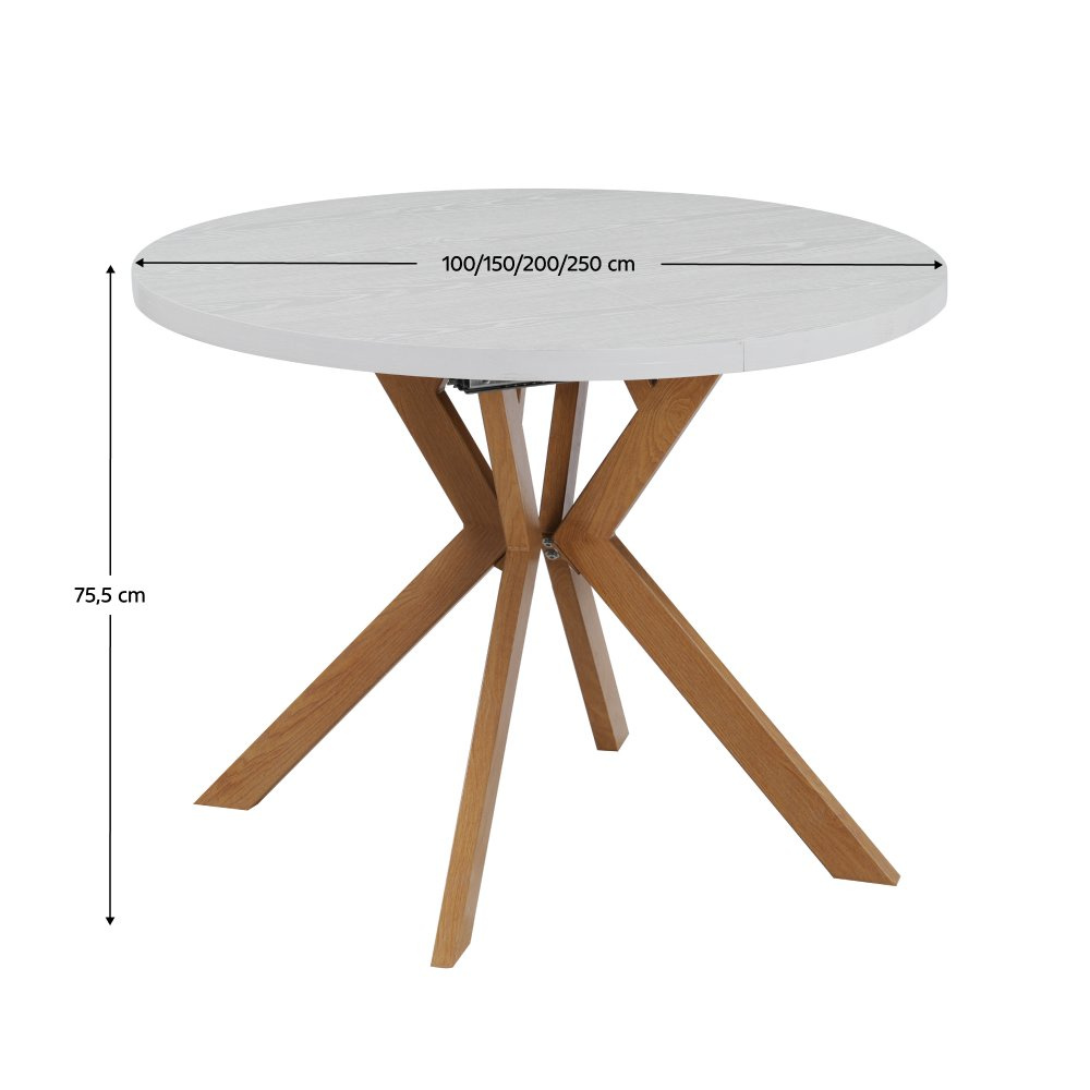 Materiál deska stolu: MDF fóliovaná Barva: bílá Konstrukce nohy: kov Barva: dub Rozměry (ŠxHxV): 100x100x75,5 cm Tloušťka materiálu vrchní desky: 3,6 cm Tloušťka materiálu desek při rozkladu 1,8 cm Kulatý Praktický Rozkládací Dodáván s 3× středovými deskami Rozklad s jednou deskou: 150 cm Rozklad se dvěma deskami: 200 cm Rozklad se třemi deskami: 250 cm Vhodný pro 4-8 osob Nosnost: 38 kg Stůl je třeba zatěžovat rovnoměrně Dodáváno v demontu