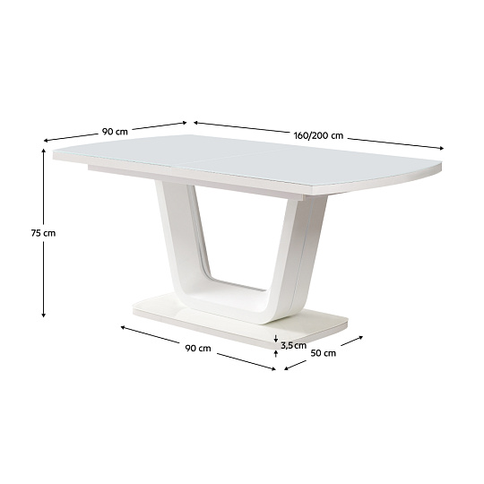 Materiál deska stolu: MDF/tvrzené sklo Barva: bílá HG Rozměry (ŠxHxV): 160-200x90x75 cm Tloušťka materiálu vrchní desky: 4,1 cm Tloušťka MDF: 3,6 cm Tloušťka tvrzeného skla: 0,5 cm Konstrukce nohy: MDF/nerezavějící kov Podstava: MDF/sklo Praktický Vhodný pro 6-8 osob Nosnost: 25 kg Dodáváno v demontu