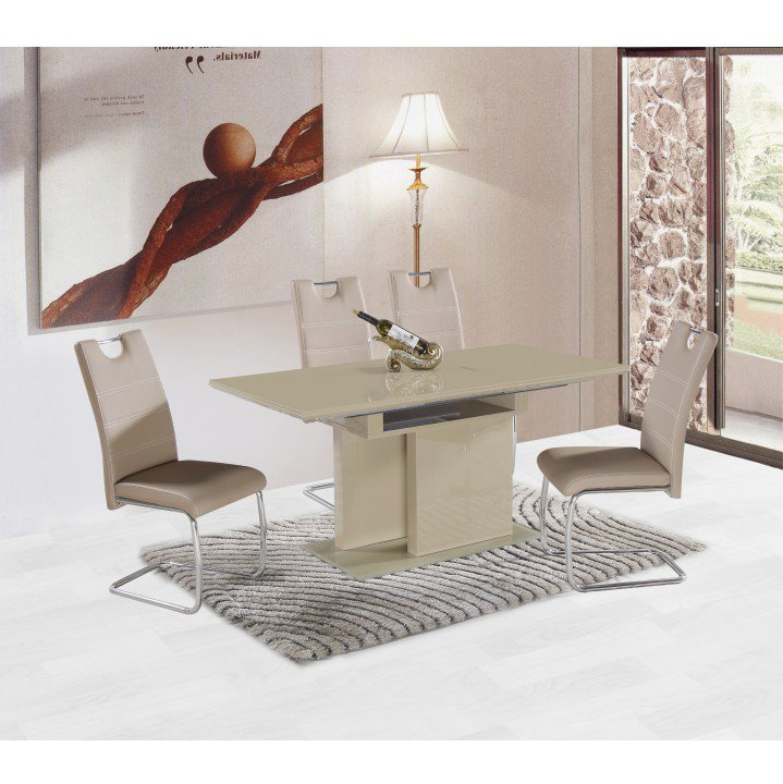 Materiál: MDF / tvrzené sklo Barva: capuccino extra vysoký lesk HG Rozměry (ŠxHxV): 120x80x76 cm rozkládací Šířka po rozložení: 160 cm Vrchní část: 40 mm Spodní část: 30 mm Pro 4-6 osob Dodávané v demontu