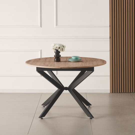 Materiál deska stolu: MDF Barva: dub artisan Konstrukce nohy: kov Barva: černá Rozměry (ŠxHxV): 100x100-140x75 cm Tloušťka materiálu vrchní desky: 1,8 cm Kulatý Praktický Vhodný pro 4-6 osob Nosnost: 25 kg Dodáváno v demontu