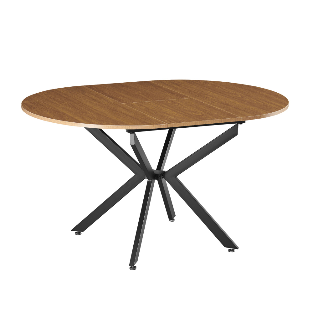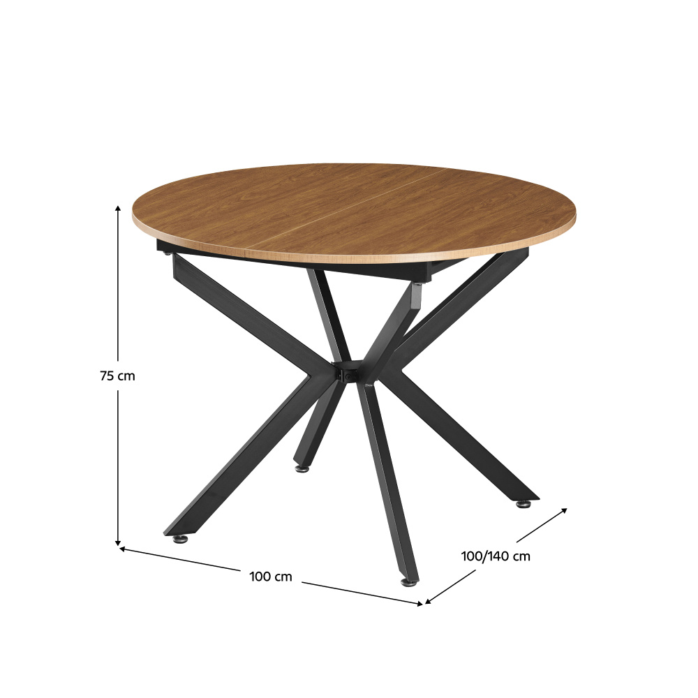 Materiál deska stolu: MDF Barva: dub světlý Konstrukce nohy: kov Barva: černá Rozměry (ŠxHxV): 100x100-140x75 cm Tloušťka materiálu vrchní desky: 1,8 cm Kulatý Praktický Vhodný pro 4-6 osob Nosnost: 25 kg Dodáváno v demontu
