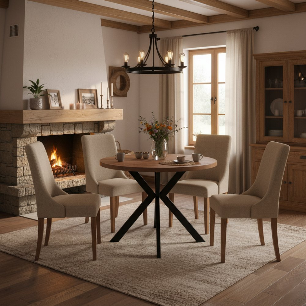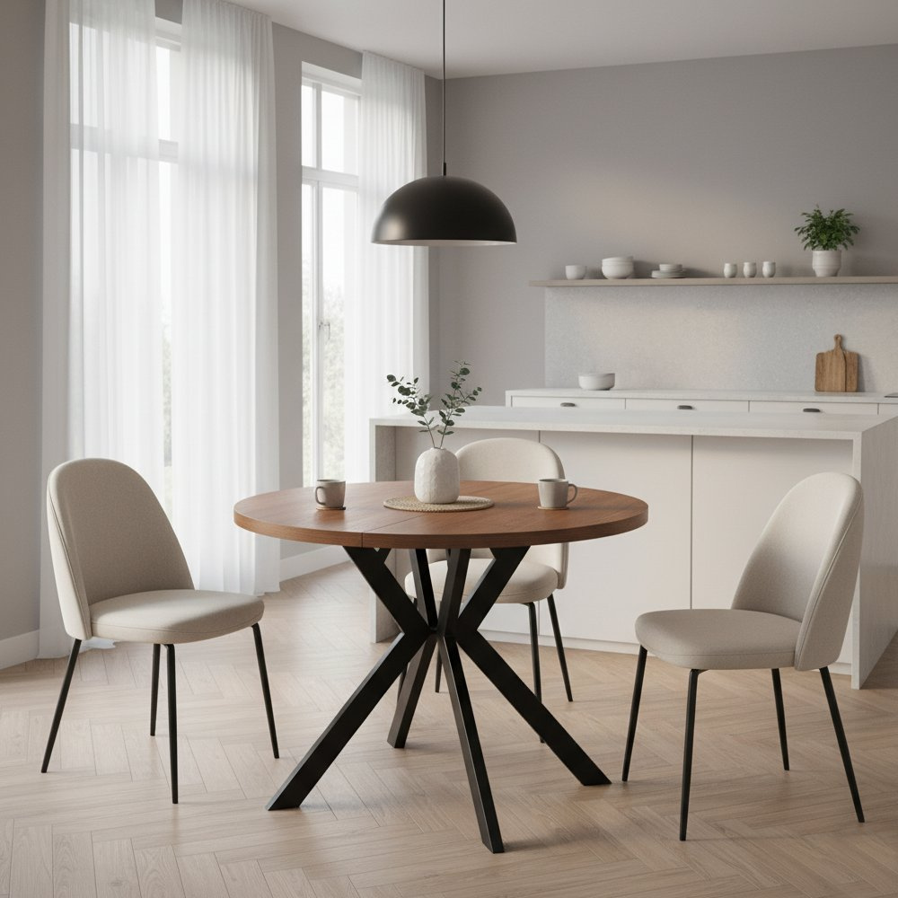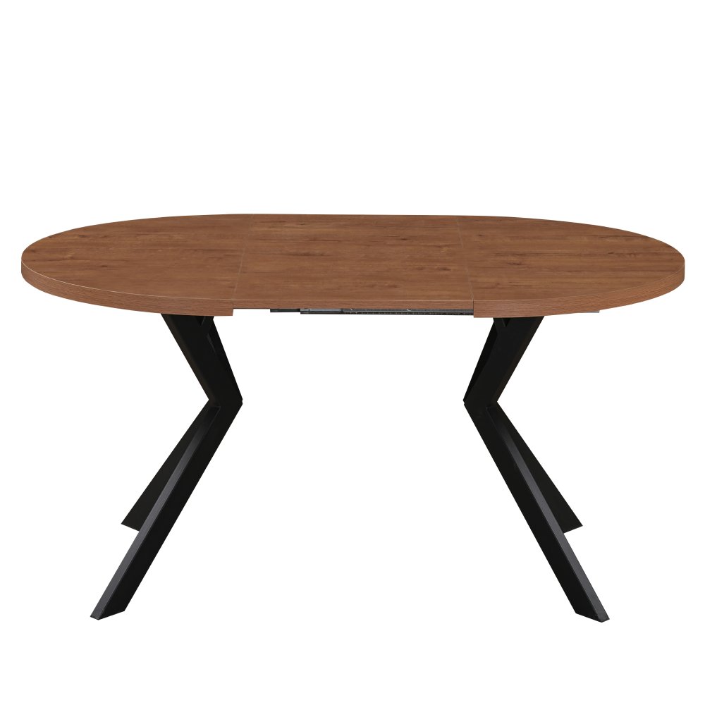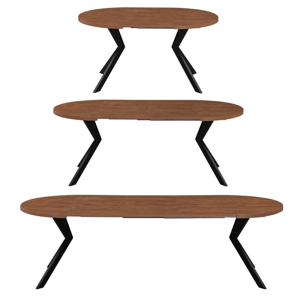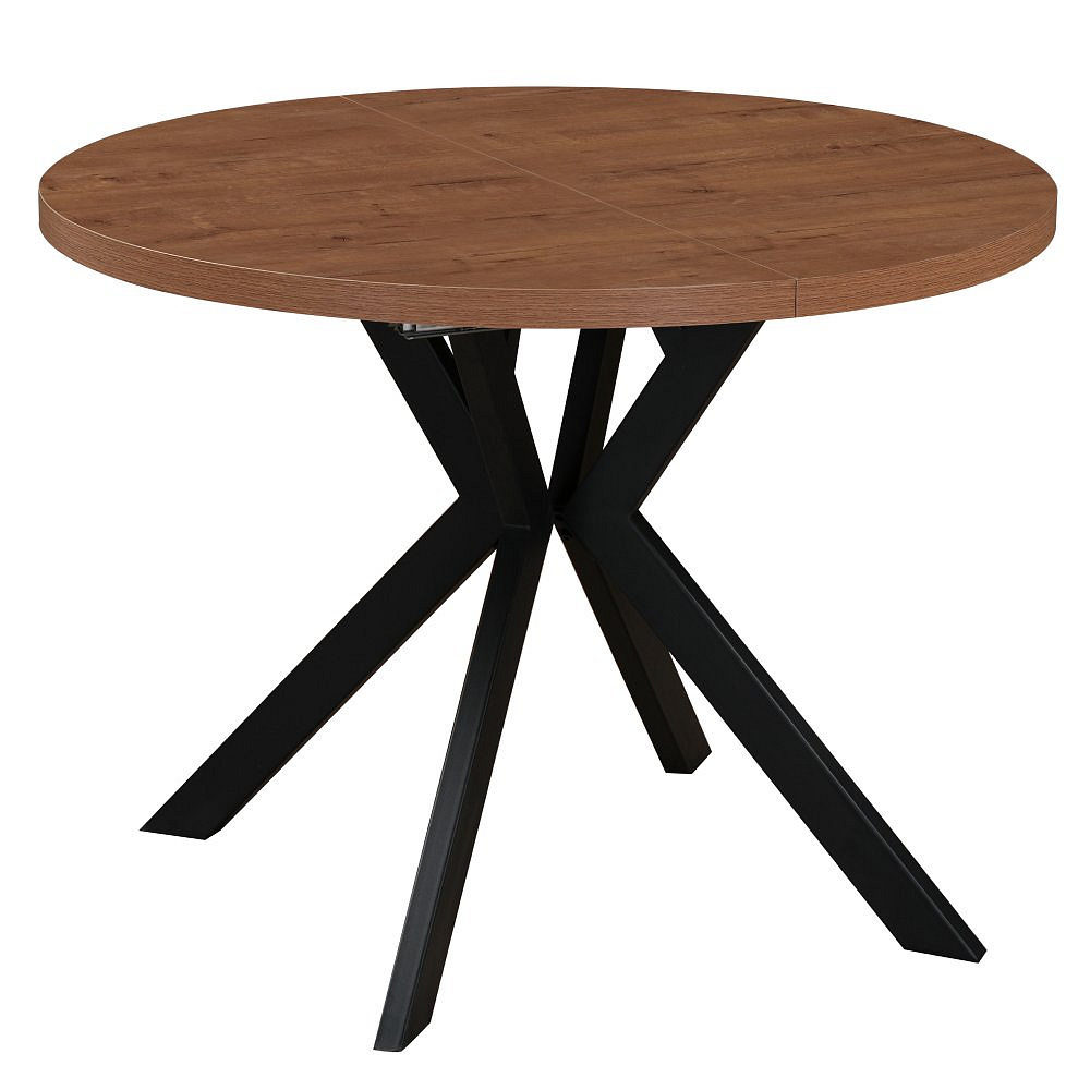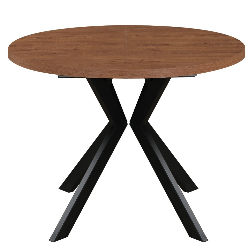 Materiál deska stolu: MDF laminovaná Barva: dub tmavý Konstrukce nohy: kov Barva: černá Rozměry (ŠxHxV): 100x100x75,5 cm Tloušťka materiálu vrchní desky: 3,6 cm Tloušťka materiálu desek při rozkladu 1,8 cm Kulatý Praktický Rozkládací Dodáván s 3× středovými deskami Rozklad s jednou deskou: 150 cm Rozklad se dvěma deskami: 200 cm Rozklad se třemi deskami: 250 cm Vhodný pro 4-8 osob Nosnost: 38 kg Stůl je třeba zatěžovat rovnoměrně Dodáváno v demontu