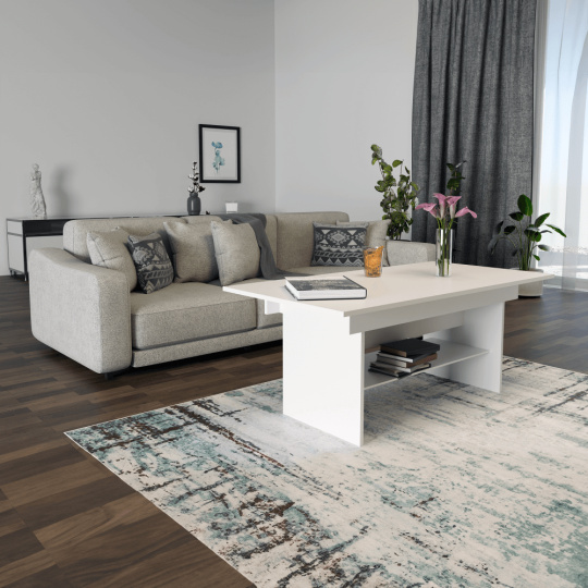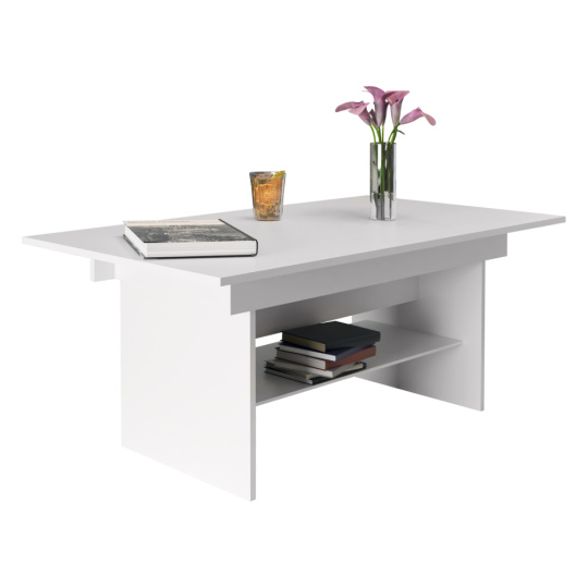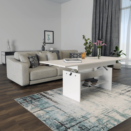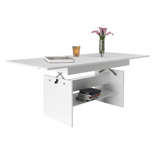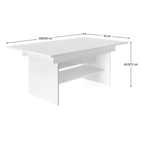 Materiál: DTD laminovaná Barva: bílá Rozměry (ŠxHxV): 120-160x70x60,5-72 cm Tloušťka DTD laminované: 1,6 cm Konferenční/jídelní Rozkládací Výškově nastavitelný Disponuje zvedacím mechanismem S policí Rozměry police: 88x30 cm Vhodný pro 4-6 osob Nosnost vrchní desky: 20 kg Moderní Dodáváno v demontu