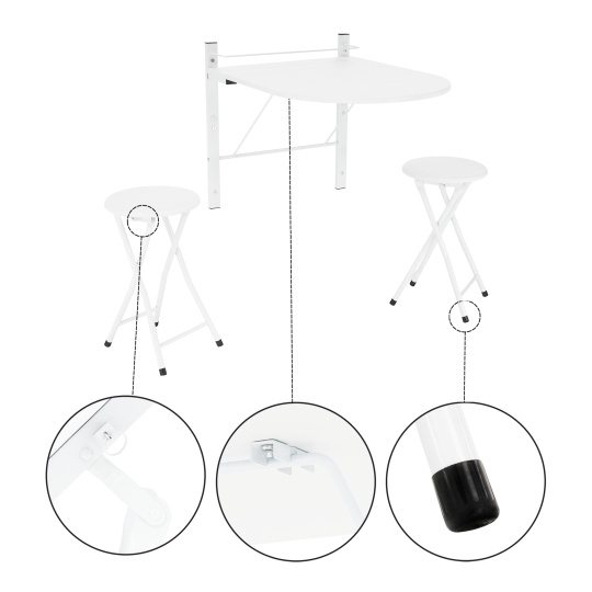 Materiál: MDF/kov Barva: bílá Rozměry (ŠxHxV): 60x80x75 cm Rozměr židle (ŠxV): 30x47 cm Tloušťka materiálu: 1,5 cm Nosnost židle: 80 kg Nosnost stolu:15 kg 3-dílný set Stolek 2x židle Skládací Moderní Praktický Dodáváno v demontu