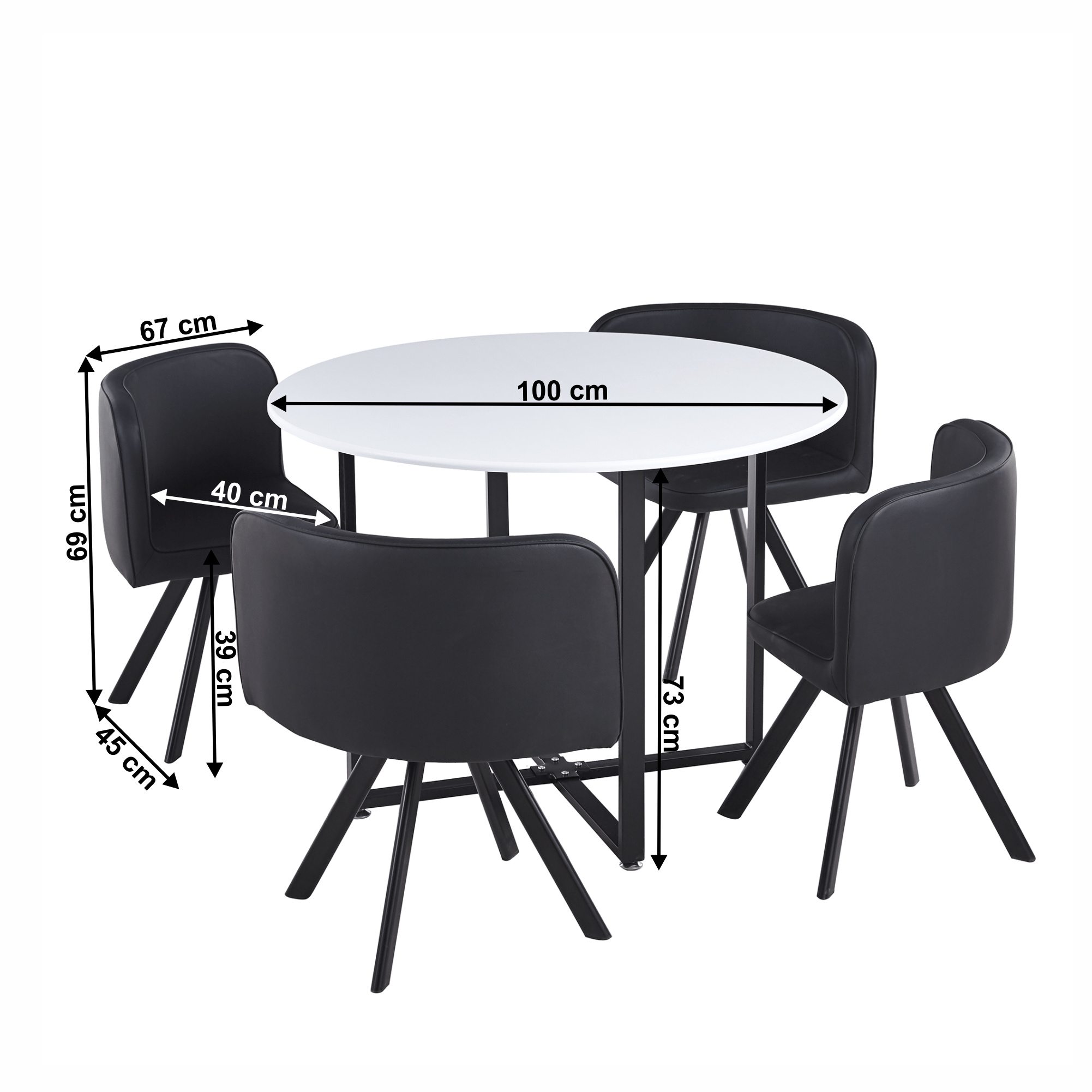 Materiál: MDF/kov/ekokůže Barevné provedení stolu: bílá/černá Barevné provedení křesla: černá/černá Oděruodolnost ekokůže podle testu Martindale: 95 000 oděrů Rozměry stůl (PxV): 100x73 cm Tloušťka plátu stolu: 1,5 cm Nosnost stolu: 15 kg Rozměry křesla (ŠxHxV): 67x45x69 cm Výška sedu: 39 cm Hloubka sedu: 40 cm Nosnost křesla: 90 kg Jeden stůl Čtyři křesla Dodáváno v demontu