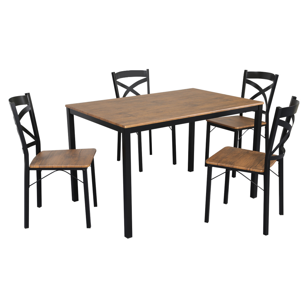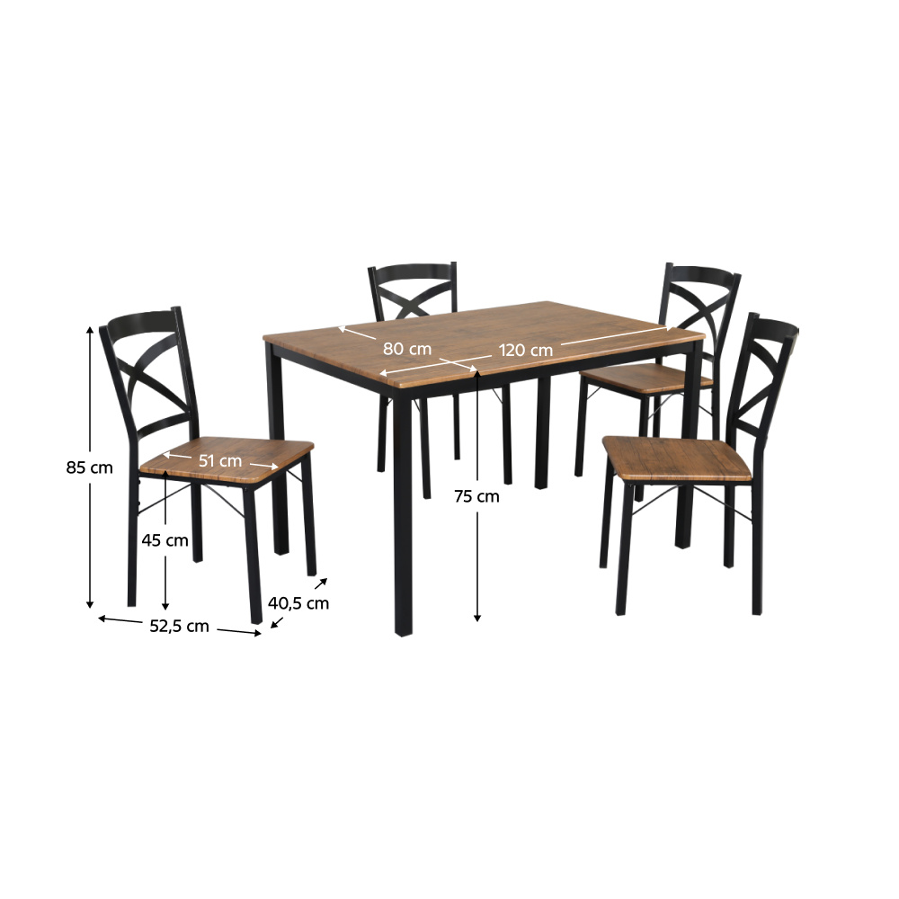Materiál: MDF/kov Barva: dub tmavý/černá Rozměry stůl (ŠxHxV): 120x80x75 cm Rozměry židle (ŠxHxV): 40,5x52,5x85 cm Výška sedu: 45 cm Hloubka sedu: 51 cm Tloušťka MDF: 1,5 cm Nosnost stůl: 20 kg Nosnost židle: 90 kg Jídelní set 1 stůl 4 židle Pro 4 osoby Dodáváno v demontu