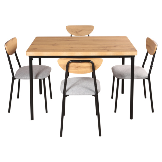 Materiál: MDF/látka/kov Barva: dub světlý/šedá/černá Oděruodolnost textilie podle testu Martindale: 85 000 oděrů Rozměry stůl (ŠxHxV): 110x70x75,5 cm Rozměry židle (ŠxHxV): 40x48,5x78 cm Výška sedu: 46 cm Hloubka sedu: 38,5 cm Tloušťka MDF: 1,5 cm Tloušťka platu stolu: 4 cm Nosnost stůl: 20 kg Nosnost židle: 90 kg Jídelní set 1 stůl 4 židle Pro 4 osoby Dodáváno v demontu