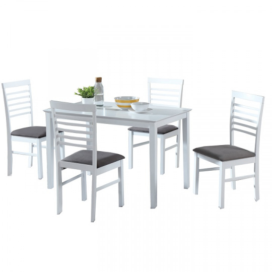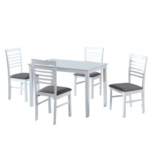 Jídelní komplet 1x stůl / 4x židle, Materiál: dřevo kaučuk / látka, Barva: bílá / šedá Rozměry (ŠxHxV): stůl: 110 x 70 x 76cm, stolička: 42 x45,5 x 93,5 cm, výška sedu: 46,5cm. Rozměry nožičky židle (ŠxH): 24x44 mm Výška sedu židle: 47 mm Hrubky nožičky stolu: 48 mm Hrubky materiálu vrchní desky: 18 mm Hrubky materiálu spodní desky: 55 mm Nosnost židle 100 kg Nosnost stola: 100 kg Dodávané v demontu.