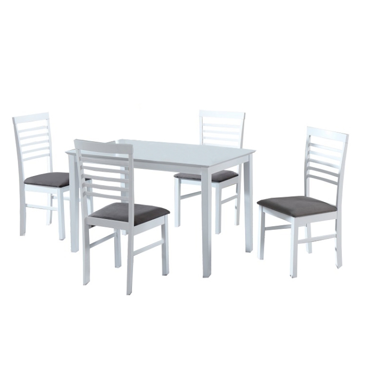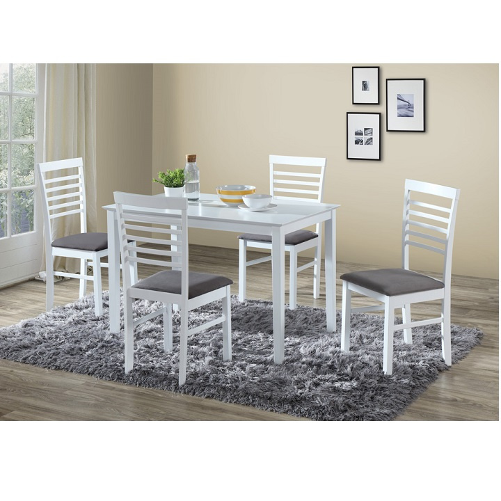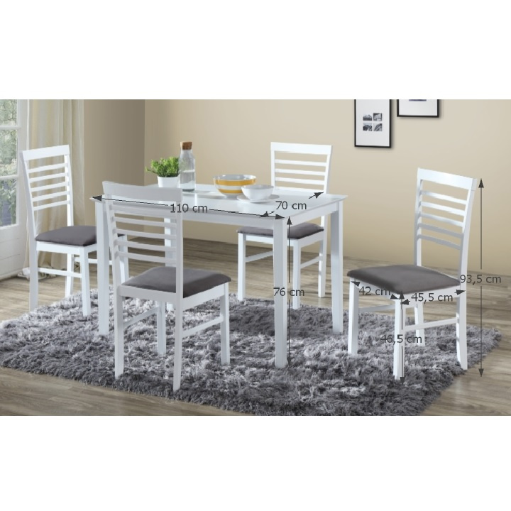 Jídelní komplet 1x stůl / 4x židle, Materiál: dřevo kaučuk / látka, Barva: bílá / šedá Rozměry (ŠxHxV): stůl: 110 x 70 x 76cm, stolička: 42 x45,5 x 93,5 cm, výška sedu: 46,5cm. Rozměry nožičky židle (ŠxH): 24x44 mm Výška sedu židle: 47 mm Hrubky nožičky stolu: 48 mm Hrubky materiálu vrchní desky: 18 mm Hrubky materiálu spodní desky: 55 mm Nosnost židle 100 kg Nosnost stola: 100 kg Dodávané v demontu.
