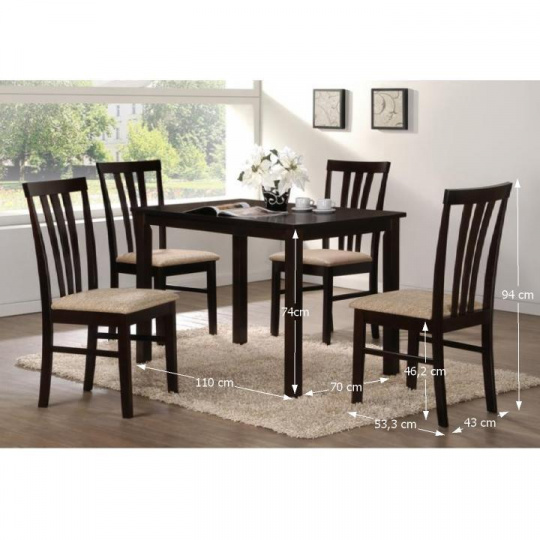 Materiál: dřevo / látka Barva: wenge / krémová Rozměry stolu (ŠxHxV): 110x70x74 cm Rozměry židle (ŠxHxV): 43x50,3x94 cm Výška sedu: 46,2cm Nosnost židle 100 kg Nosnost stola: 100 kg Dodávané v demontu