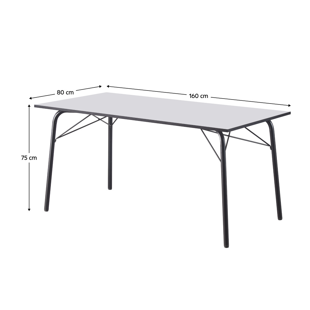 Materiál: MDF/kov Barva: bílá/černá Rozměry (ŠxHxV): 160x80x75 cm Tloušťka materiálu vrchní desky: 1,8 cm Nosnost: 25 kg Jednoduchý Minimalistický Klasické provedení Kovové nohy Jednoduchá údržba S kluzáky pro ochranu podlahy Stolování pro 6-8 lidí Dodáváno v demontu