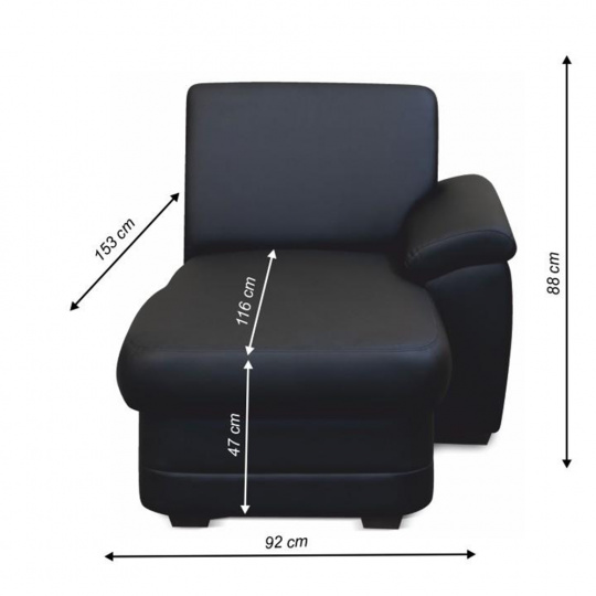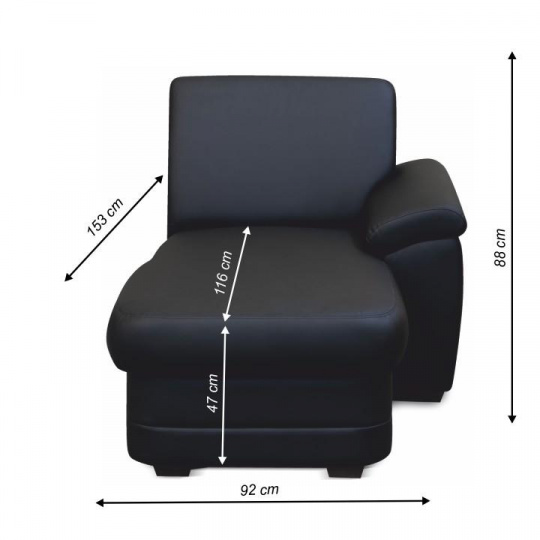Otoman, pravá, BITER OTT 1B ZP Materiál: ekokůže Oděruodolnost textilie podle testu Martindale: 100 000 oděrek Barva: černá Rozměry (ŠxHxV): 92x153x88 cm Výška spodního prostoru od podlahy: 3 cm Nosnost na osobu: 90 kg Dodací lhůta 6-8 týdnů. Nabízíme vám možnost zvolit si barevný odstín ze sedmi barev látky Cable a ze sedmi barev