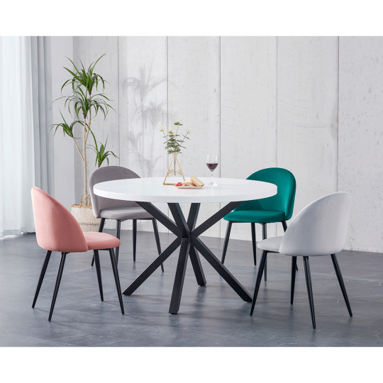 Jídelní stůl MEDOR Materiál deska stolu: MDF Barva: bílá matná Konstrukce nohy: kov Barva: černá Rozměry PxV: 120x76 cm Tloušťka vrchního plátu: 4 cm Nosnost: 30 kg Kulatý Industriální styl Dodáváno v demontu
