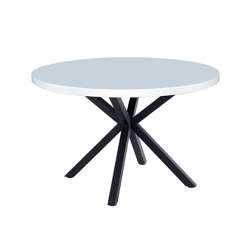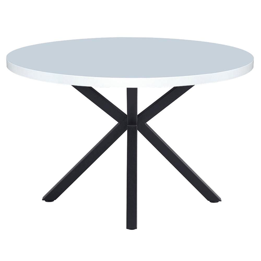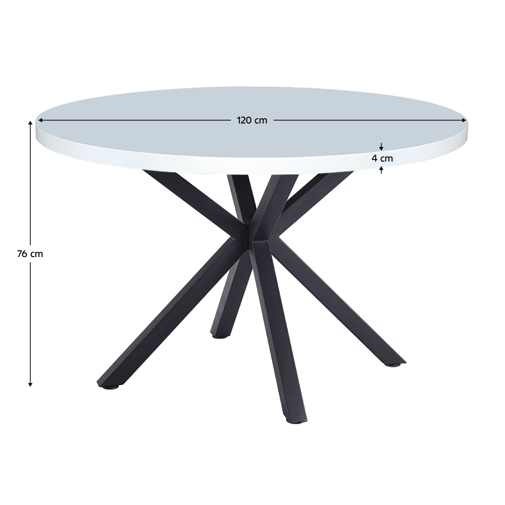 Jídelní stůl MEDOR Materiál deska stolu: MDF Barva: bílá matná Konstrukce nohy: kov Barva: černá Rozměry PxV: 120x76 cm Tloušťka vrchního plátu: 4 cm Nosnost: 30 kg Kulatý Industriální styl Dodáváno v demontu