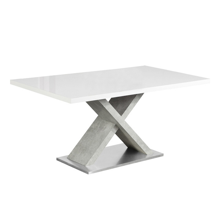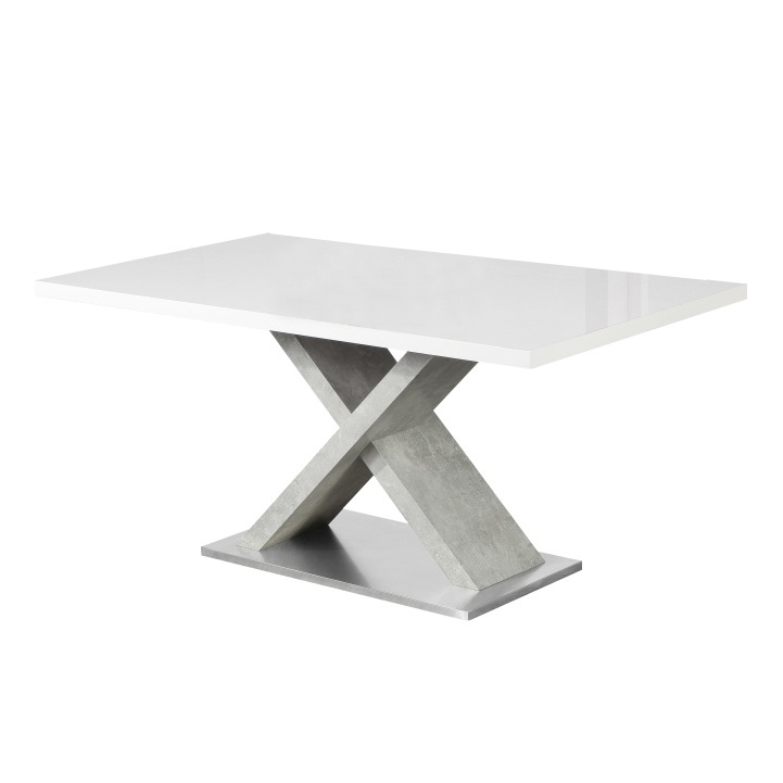 jídelní stůl Materiál: MDF / kov Barva: bílý vysoký lesk HG / beton Rozměry (ŠxHxV): 160x90x76 cm Tloušťka materiálu vrchní část: 40 mm Tloušťka materiálu střední část: 60 mm Tloušťka materiálu spodní část: 25 mm Dodávané v demontu.