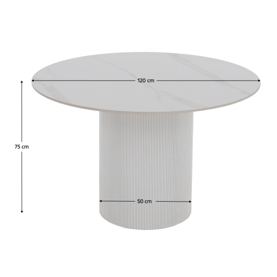 Materiál deska stolu: broušený kámen Barevné provedení: bílý mramor Konstrukce nohy: MDF Barevné provedení: bílá Rozměry stolku (PxV): 120x75 cm Tloušťka platu stolu: 1,1 cm Originální kousek Kulatý Moderní a stylový Nosnost: 50 kg Dodáváno v demontu