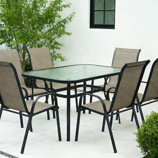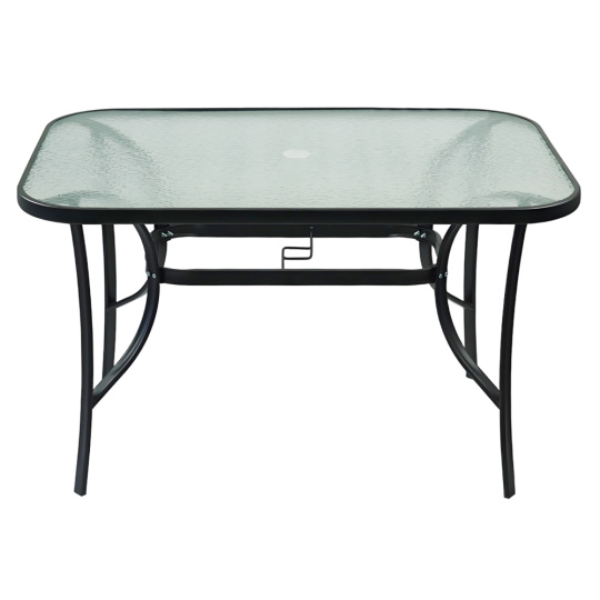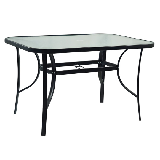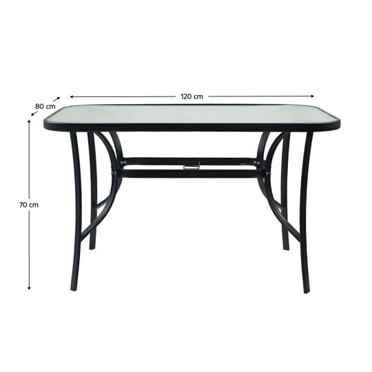 Jídelní stůl DEMAT NEW vhodný k zahradnímu setu Materiál: tvrzené sklo/ocel Barva: černá Rozměry (ŠxHxV): 120x80x70 cm S otvorem pro osazení slunečníku Nosnost: 50 kg Dodáván v demontu