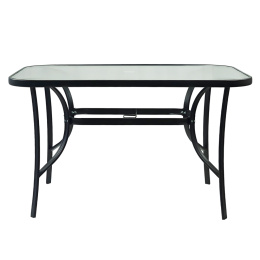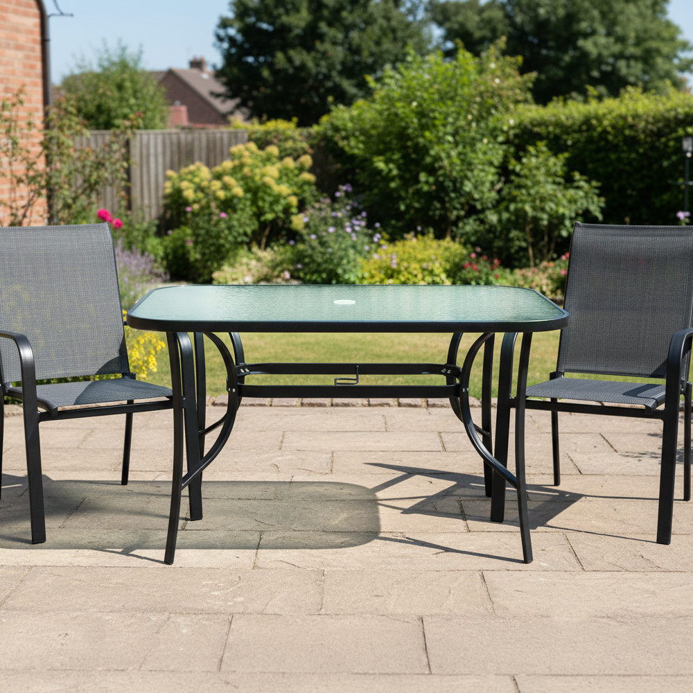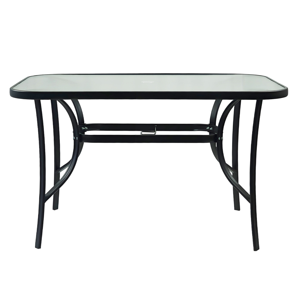 Jídelní stůl DEMAT NEW vhodný k zahradnímu setu Materiál: tvrzené sklo/ocel Barva: černá Rozměry (ŠxHxV): 120x80x70 cm S otvorem pro osazení slunečníku Nosnost: 50 kg Dodáván v demontu